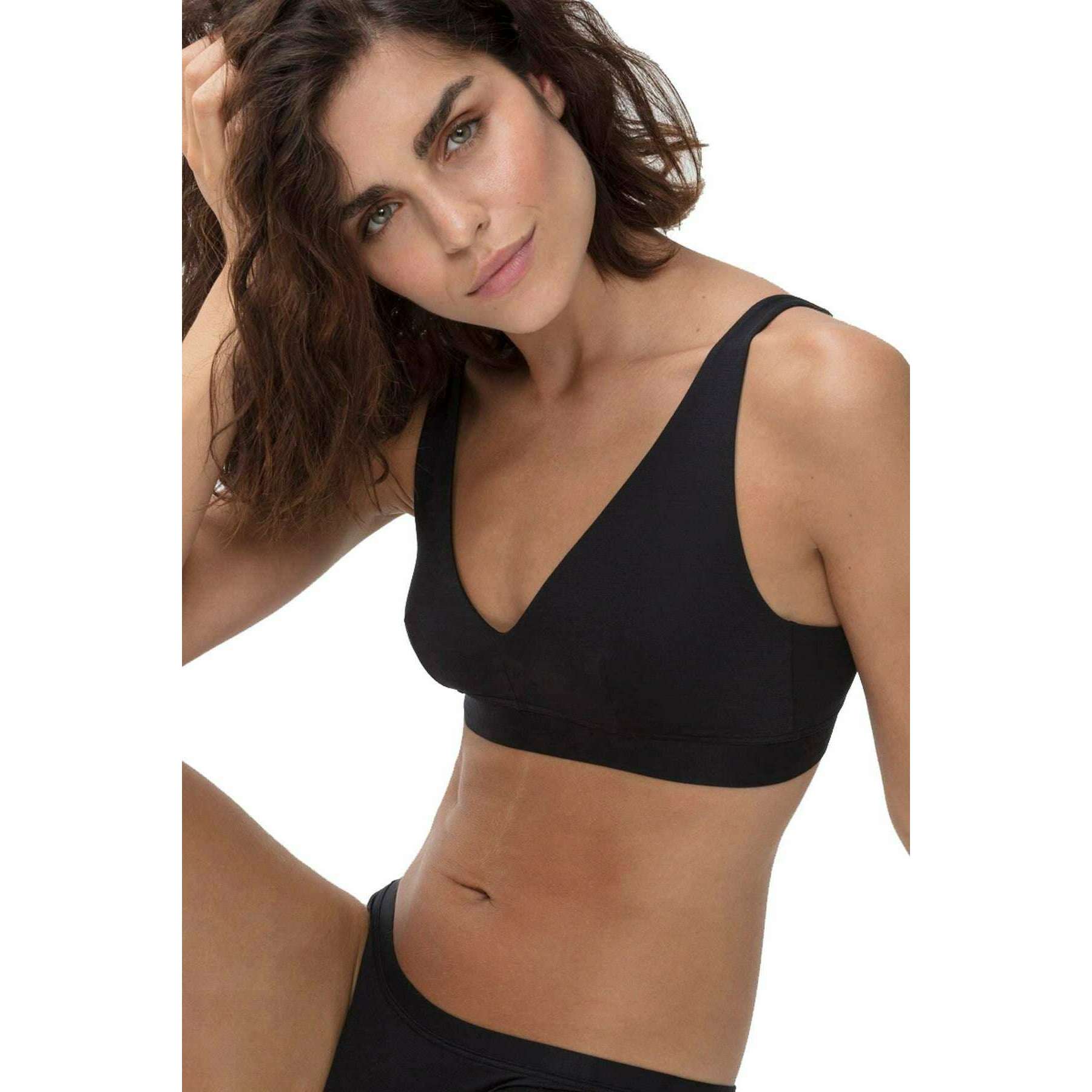 This well made women's mood triangle bra from Mey comes in a black colour and is manufactured from 57% modal, 35% polyester and 8% elastane. Also the black underwear is designed in a plain pattern, It is recommended to machine wash at 40 degrees, not suitable for tumble drying to keep this underwear in good condition. All the underwear comes complete in mey packaging. The Mey Mood Triangle Bra - Black is the perfect choice if you are wanting a comfortable and classic wear. This bra features no padding and no underwire for optimal comfort and the material has a breathable COOLMAX finish great for everyday wear. The elasticated under band ensure a flexible fit and the wide straps help keep everything in place. It is secured with a hook and eyelet fastener for a secure wear.