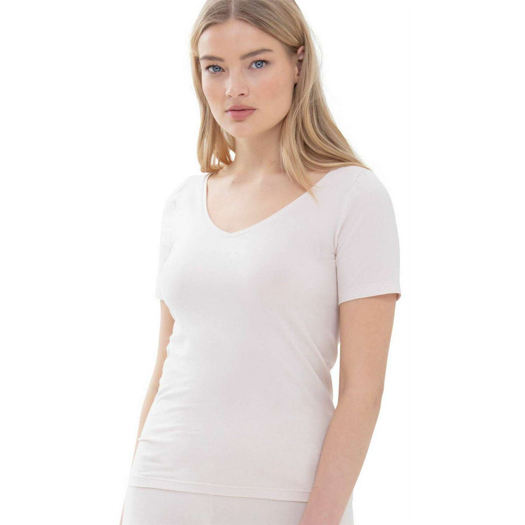 Designer Mey has brought you this women's 92% organic cotton and 8% elastane t-shirt using bailey beige tones. Also the bailey beige t-shirt is designed in a plain pattern, It is recommended to machine wash at 40 degrees to keep this t-shirt in good condition. All the t-shirts come complete with mey packaging. The Mey Superfine Organic Short-Sleeved Top - Bailey Beige is a must-have in any woman s collection. Features a low v neckline and a slim fit providing a simple and classic design. Crafted from a high proportion of cotton ensures this top is skin-friendly and breathable, perfect for anyone. This top is Oeko-Tex-Standard 100 and GOTS (global organic textile standard) certified and has sustainable factors that include resource-friendly materials and short transport distances.