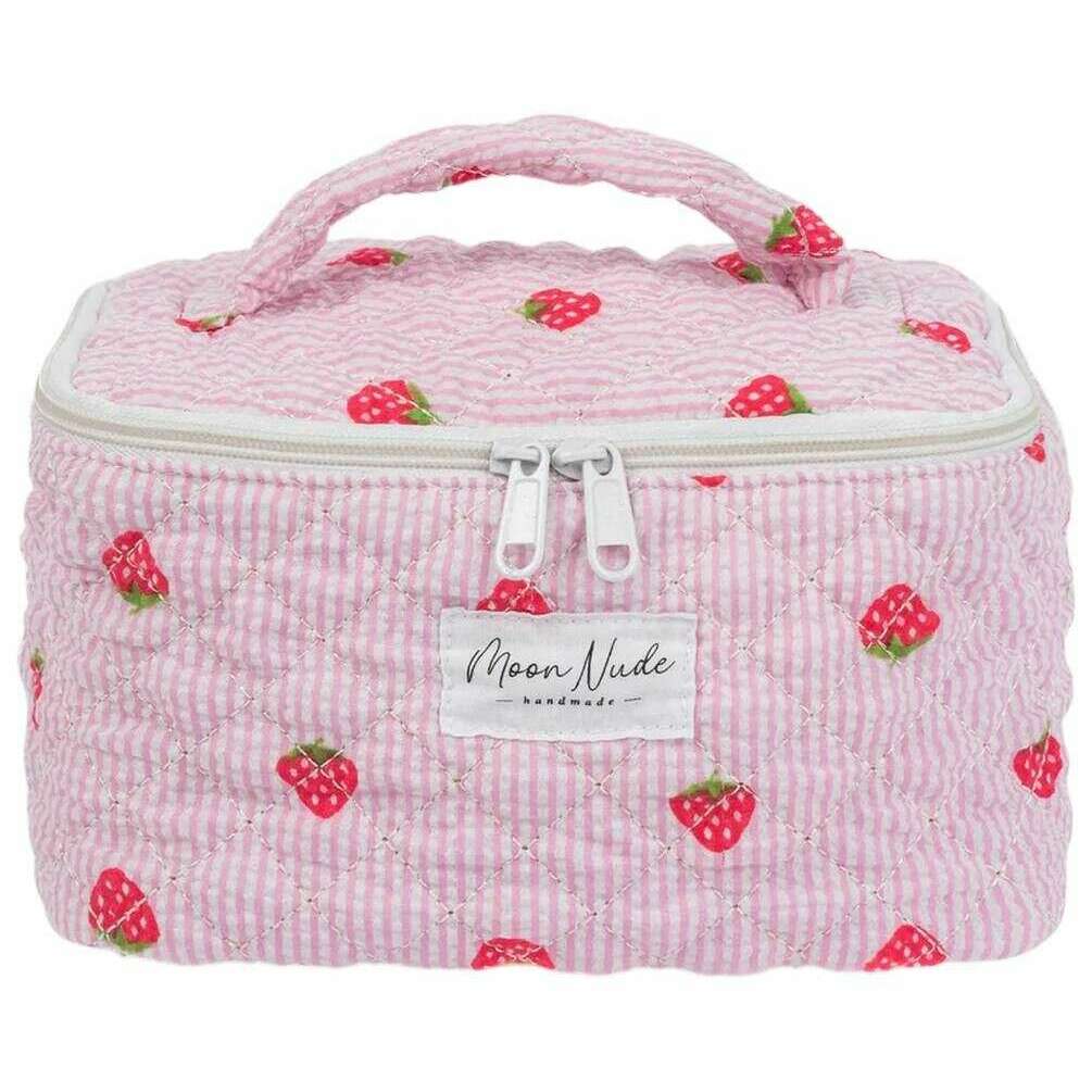 Designer Moon Nude has brought you this women's 100% cotton bag using pink/red/green tones. It measures 16cm(height) x 22cm(width) x 14cm(depth). It is recommended to wash by hand in cold water with a mild detergent, or maching wash inside out on a delicate cycle. to keep this bag in good condition. All the bags come complete with moon nude packaging. The Moon Nude Strawberry Vanity Bag - Pink/Red/Green is an absolute necessity for travelling or everyday use. This vanity bag is guaranteed to keep all your makeup or skin care in one place, whilst also being stylish and fashionable with its handmade quilted design.
