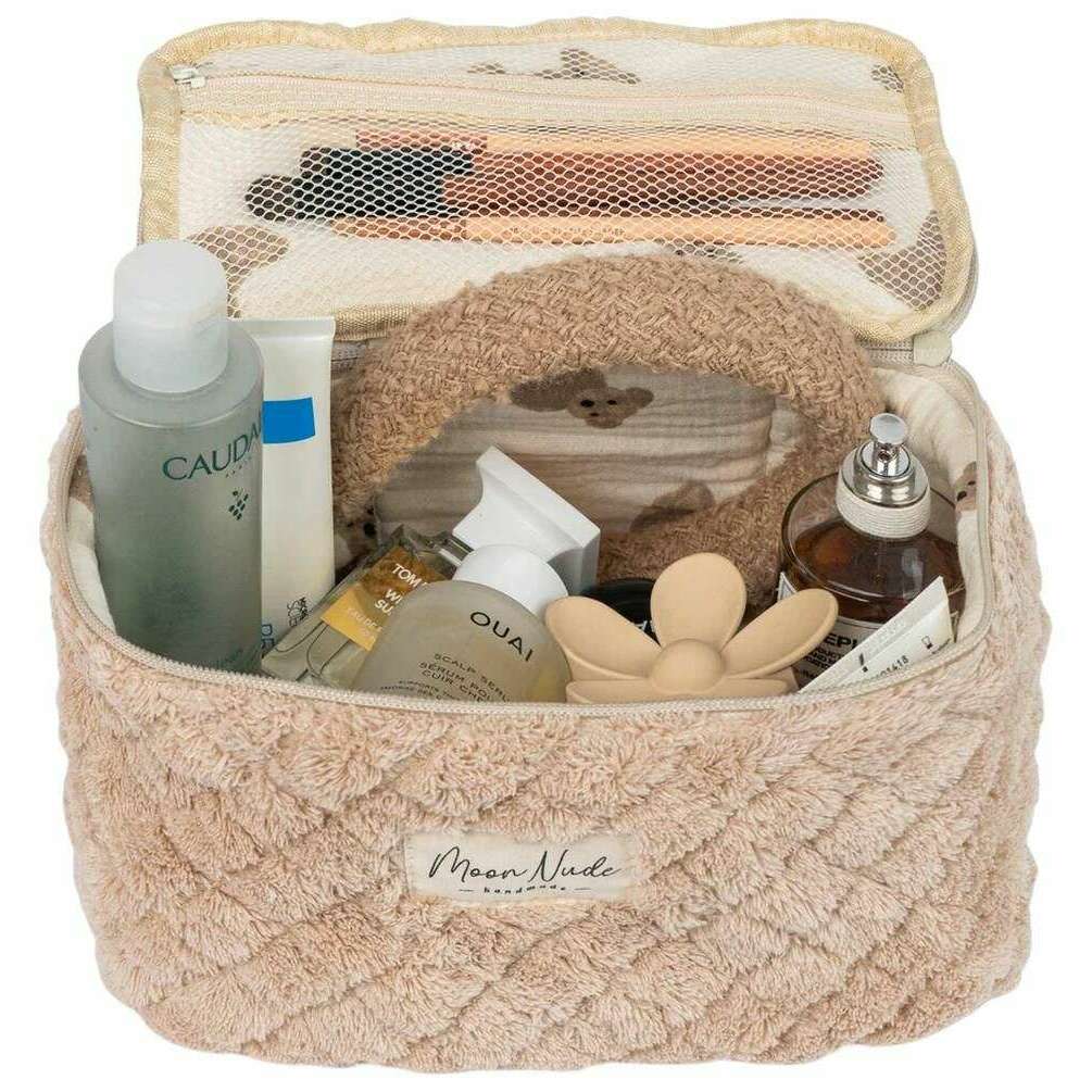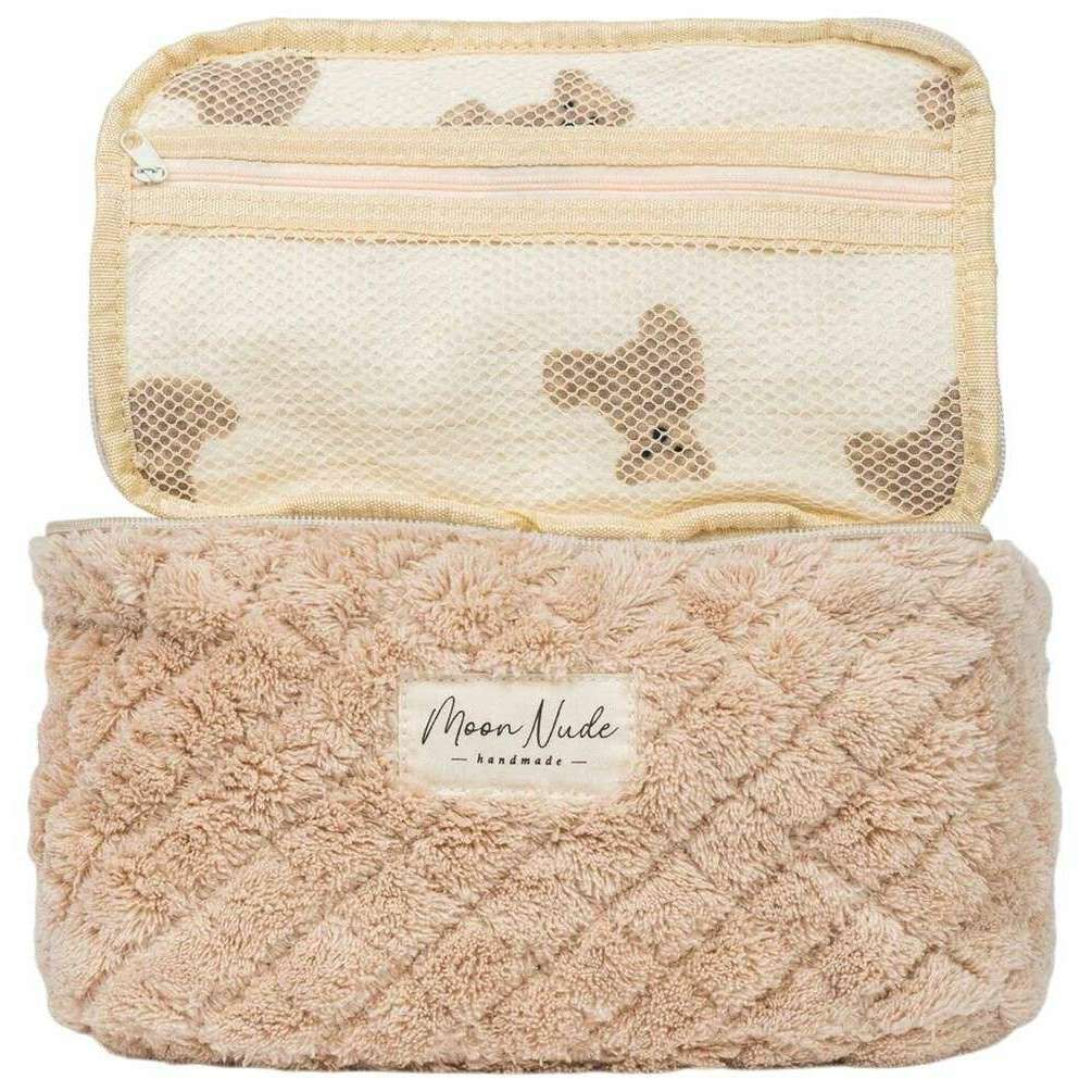 This teddy vanity bag for women is fashioned by the brand Moon Nude in a beige colour and is made from 100% cotton. It measures 16cm(height) x 22cm(width) x 14cm(depth). It is recommended to wash by hand in cold water with a mild detergent, or maching wash inside out on a delicate cycle. to keep this bag in good condition. All the bags come complete with moon nude packaging. The Moon Nude Teddy Vanity Bag - Beige is an absolute necessity for travelling or everyday use. This vanity bag is guaranteed to keep all your makeup or skin care in one place, whilst also being stylish and fashionable with its handmade quilted design.