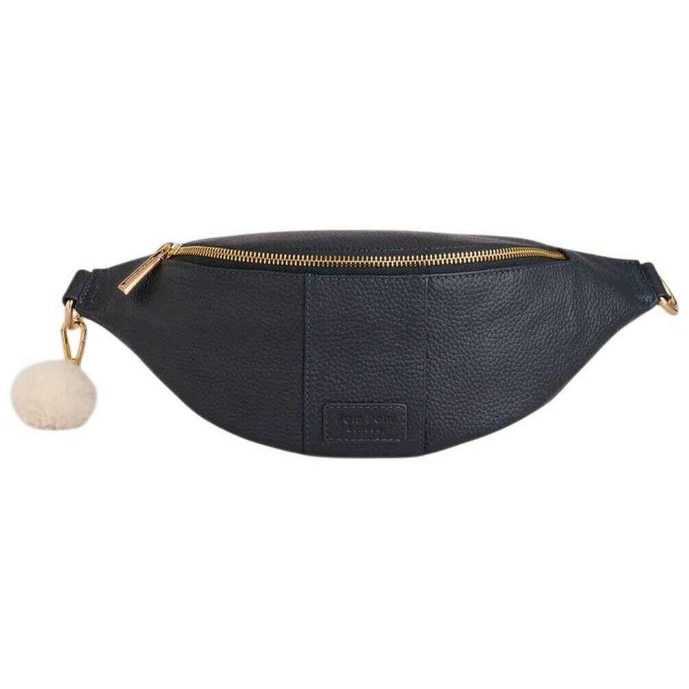 This bum bag for women is fashioned by the brand Pom Pom London in a navy colour and is made from 100% full-grain leather. It measures 12cm(height) x 33cm(width) x 11cm(depth). All the bags come complete with pom pom london packaging. The Pom Pom London Bum Bag - Navy is designed for anyone seeking a stylish, hands?free option that doesn t compromise on elegance. Its sleek silhouette and modern appeal make it the perfect accessory for days on the move, travel adventures, or everyday errands. Crafted from full?grain leather, it delivers both durability and a luxurious finish. The bag features a versatile nylon strap that can be adjusted for a comfortable and personalised fit, whether worn around the waist or styled crossbody. For practical organisation, it includes a separate external zipped compartment that provides quick access to essentials, as well as an internal zip pocket designed to keep valuables secure and neatly arranged. Finishing the look, Pom Pom London s signature gold hardware adds a touch of iconic elegance that elevates this everyday essential.