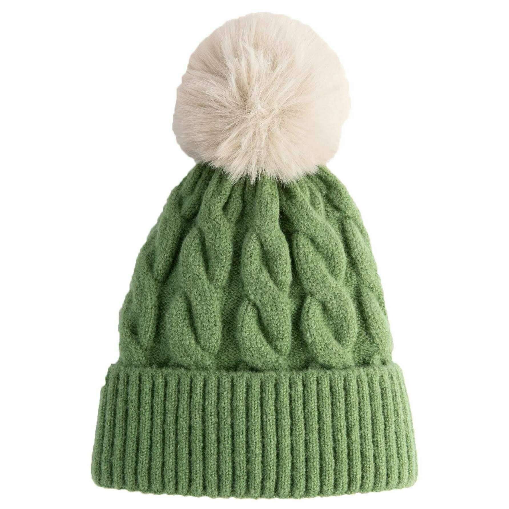 • Faux Fur Pom Pom , Chunky Braid Style Knit , Ribbed Turnt-Up Band