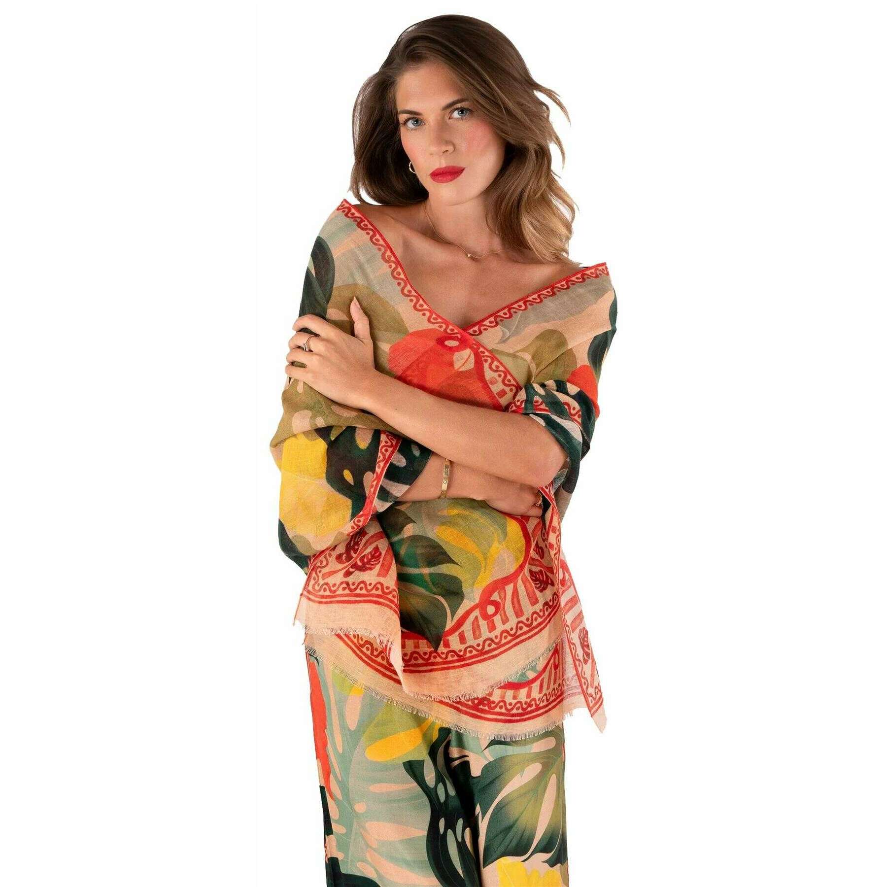 This women's exotic leaves linen cotton scarf by the brand Powder is made from 70% linen and 30% cotton blend and is showcased in red. It measures 182cm(height) x 57cm(width). Also the beige/red/blue scarf is designed in a floral pattern, All the scarves come complete with powder packaging. The Powder Exotic Leaves Linen Cotton Scarf - Beige/Red/Blue features a bespoke print that is sure to be the perfect addition to finish off your attire. With a gorgeous smooth texture and exotic pallet, this luxurious scarf will keep you wrapped up warm, whilst giving a classy and sophisticated look to your wardrobe.