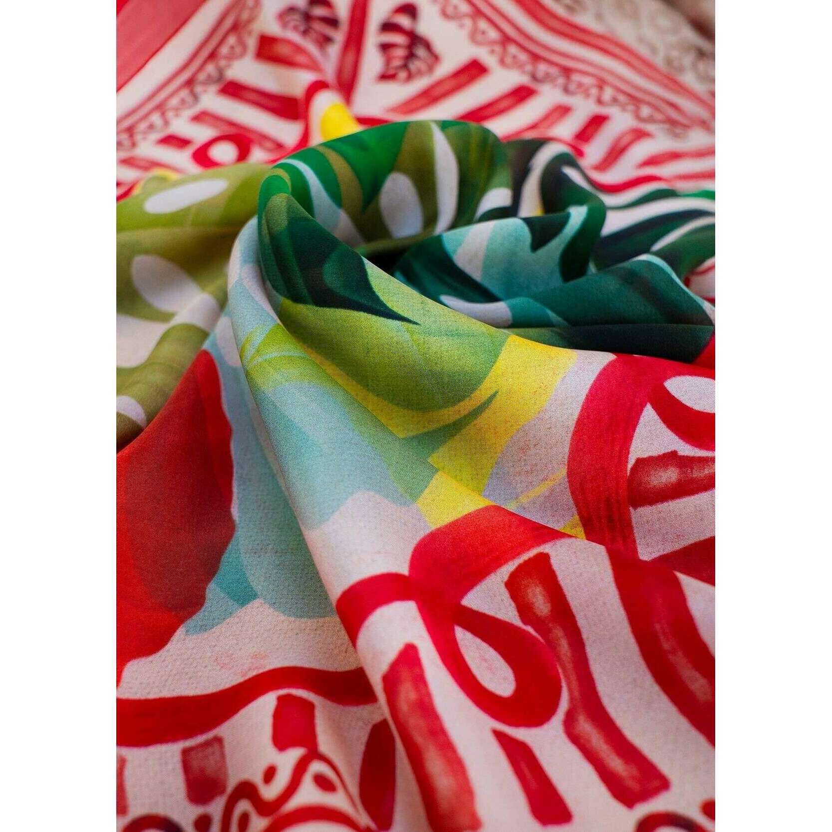 Powder Exotic Leaves Silk Square Scarf - Red/Beige/Green