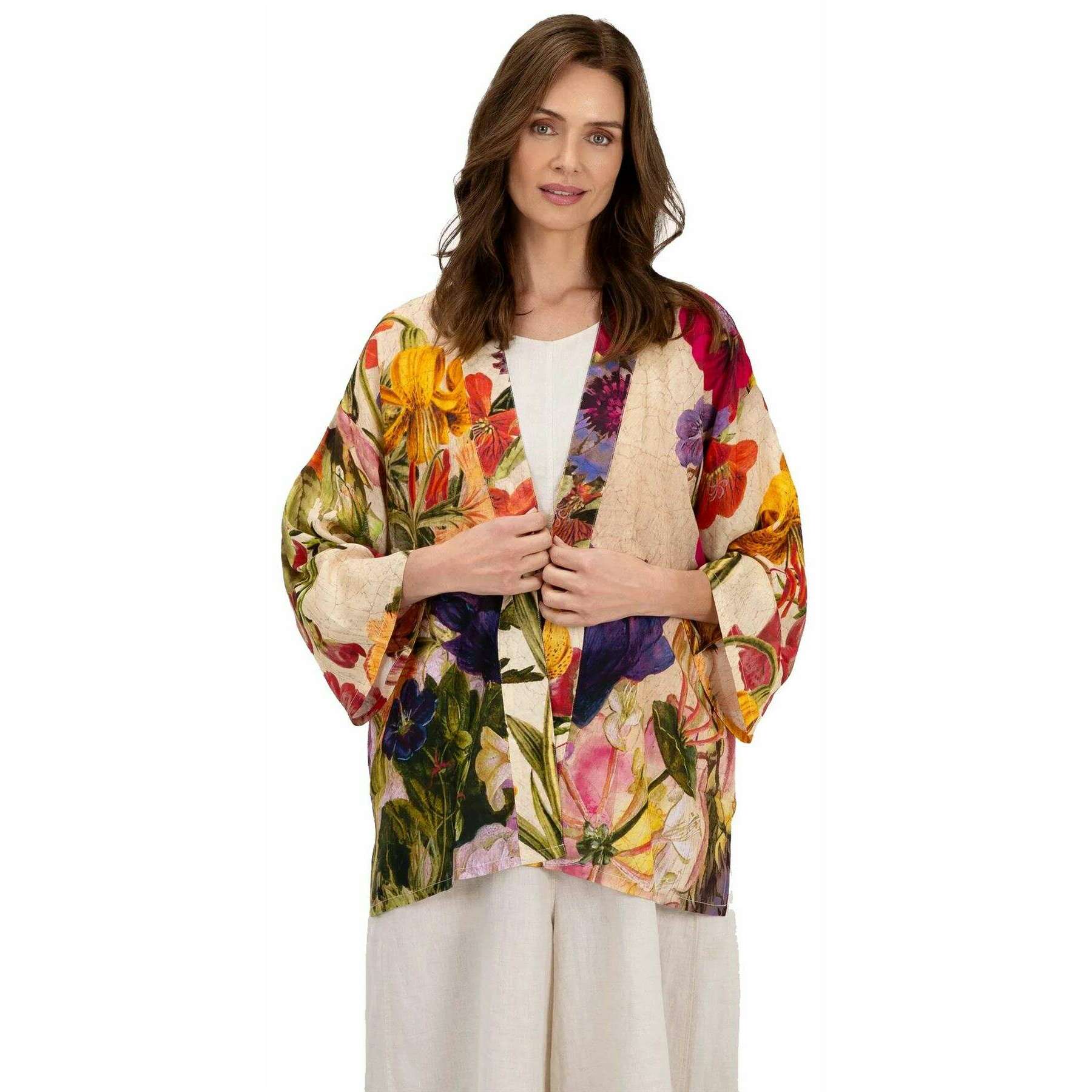 Manufactured from 50% viscose and 50% modal is this cream women's mid-length posy kimono by the designer Powder. Also the cream jacket is designed in a floral pattern, It is recommended to cool hand wash to keep this jacket in good condition. All the jackets come complete with powder tags. The Powder Mid-Length Posy Kimono - Cream will provide you with a real standout look that you are sure to love! The bold colours and the intricate design make this jacket really standout. Wear with jeans and a top for the ideal coverup.
