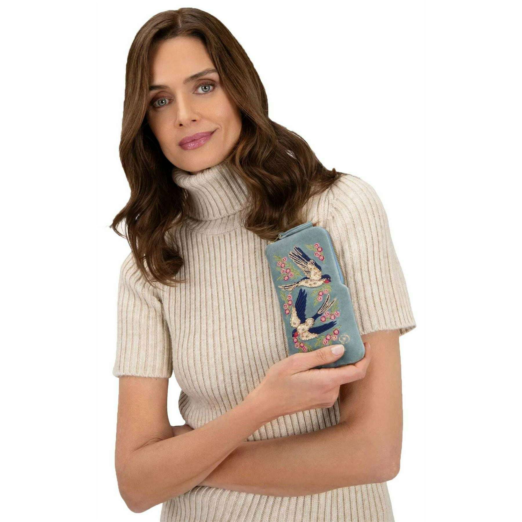 Introducing this women's swooping swallows velvet sunglasses pouch by Powder, it is manufactured from 100% polyester velvet in a ice blue colour. It measures 20cm(height) x 10cm(width). All the accessory cases come complete with powder tags. The Powder Swooping Swallows Velvet Sunglasses Pouch - Ice Blue will level up your sunglasses game, keeping them safe and protected in style. The hand embroidered design will bring a touch of fun to your everyday. As well as beautiful, the design is also practical with a simplistic yet secure zipped closure, allowing you easy access to your sunglasses for when you need them.