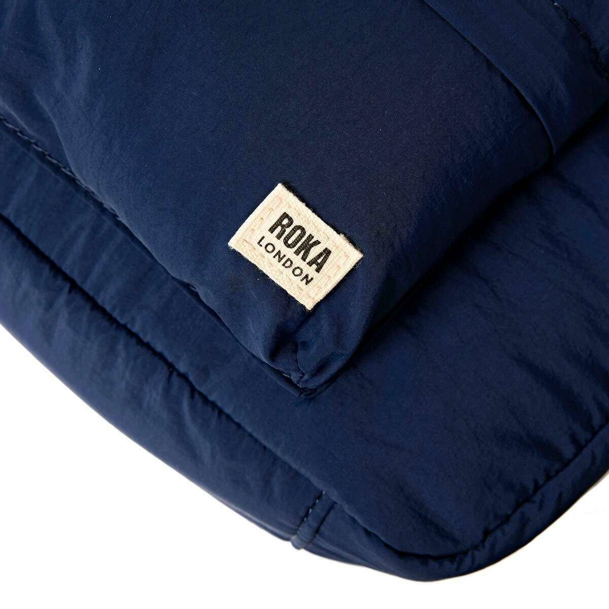 Introducing this unisex belsize recycled taslon small handbag by Roka, it is manufactured from 100% recycled nylon in a midnight blue colour. It measures 25cm(height) x 28cm(width) x 10cm(depth). All the bags come complete with roka packaging. The Roka Belsize Recycled Taslon Small Handbag - Midnight Blue is a stylish and versatile puff taslon bag that combines functionality with a delightful design. With a strap that allows you to wear over the shoulder, this smaller bag features a spacious interior, nylon zipped pocket and extra compartments for all your essentials. There is an external puffed B-pocket for quick access to your most used items whilst on the move. Perfect for work, travel or weekend adventure, while giving off contemporary, eye-catching vibes.