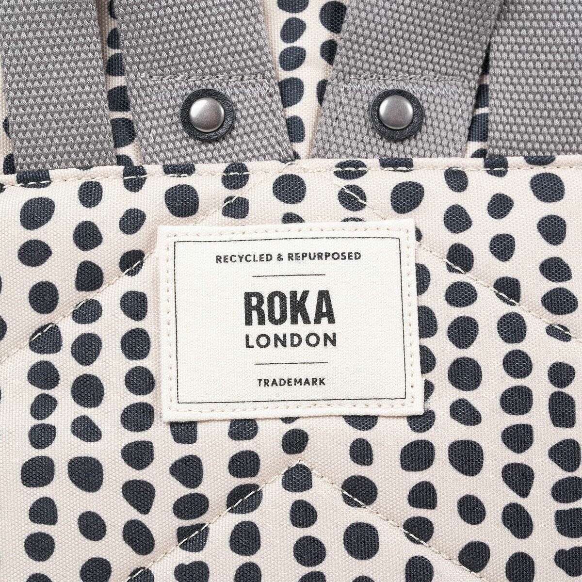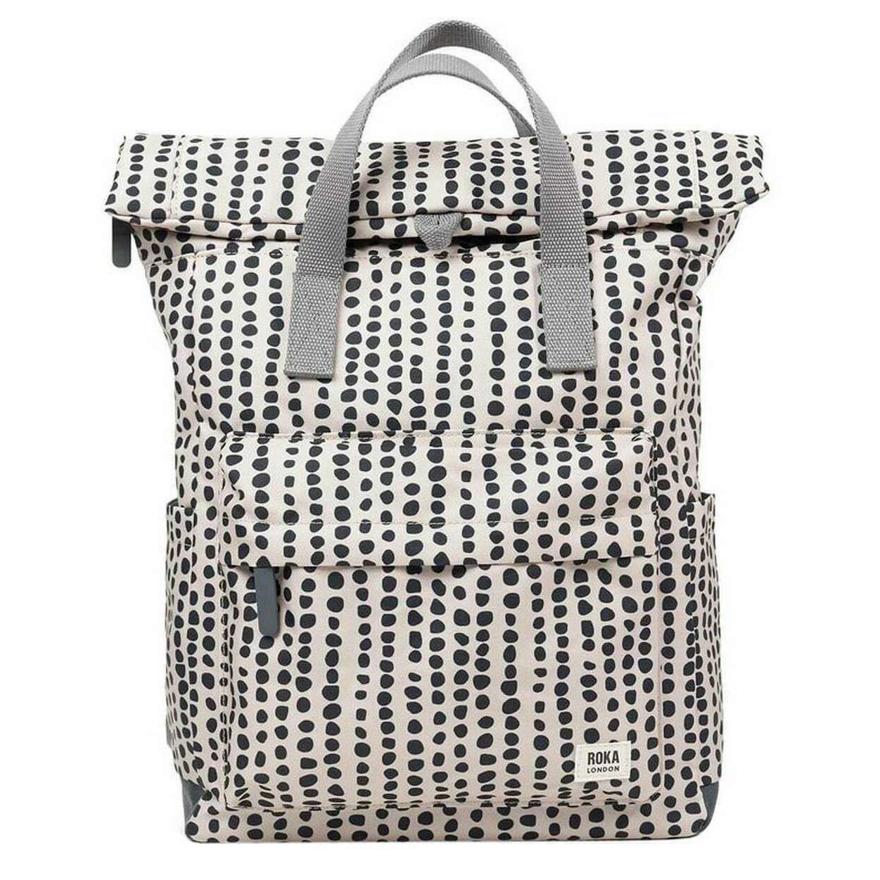 This unisex canfield b medium linear dot recycled canvas backpack has been made from 100% recycled canvas, featured in a cream colour and is from the brand Roka. It measures 42cm(height) x 30cm(width) x 12cm(depth). All the bags come complete with roka packaging. The Roka Canfield B Medium Linear Dot Recycled Canvas Backpack - Cream/Black is weather-resistant, durable, lightweight and features a bold, monochrome design of linear dots against a cream backdrop for a playful twist! Excellently crafted from recycled canvas material making it environmentally friendly and sustainable. The roll top design enables the backpack to have a wide mouth opening which is secured with a sturdy zip and magnetic hold, carrying your essentials couldn t be safer. This bag come equipped with a padded 15 laptop compartment and two side pockets perfect for water bottles. Fitted with webbed straps you can carry it on your back or at your side using its sturdy handles. Whether you want a stylish carry for work, travel, or daily errands, there s a Linear Dot variant that delivers both form and function.