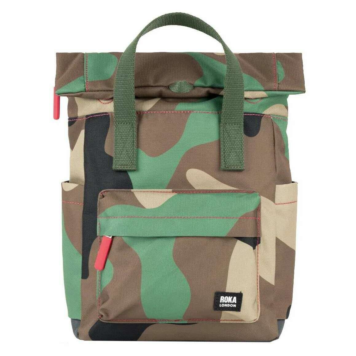 Manufactured from 100% recycled canvas (triple-coated) is this vintage camo green unisex canfield b small recycled canvas backpack by the designer Roka. It measures 32cm(height) x 23.5cm(width) x 9.6cm(depth). All the bags come complete with roka packaging. The Roka Canfield B Small Recycled Canvas Backpack - Vintage Camo Green is weather-resistant, durable, lightweight and features a vintage camo design for a playful twist! The roll top design enables the backpack to have a wide mouth opening which is secured with a sturdy zip and magnetic hold, carrying your essentials couldn t be safer. Featuring a secret wallet pocket and a tablet section, this backpack allows you to carry everything you may need on your day-to-day travels. Carry in complete comfort with the adjustable cotton webbing straps or the twin carry handles. 12 or more plastic bottles are used to make the rPET material for this bag so it is environmentally friendly and also completely vegan.