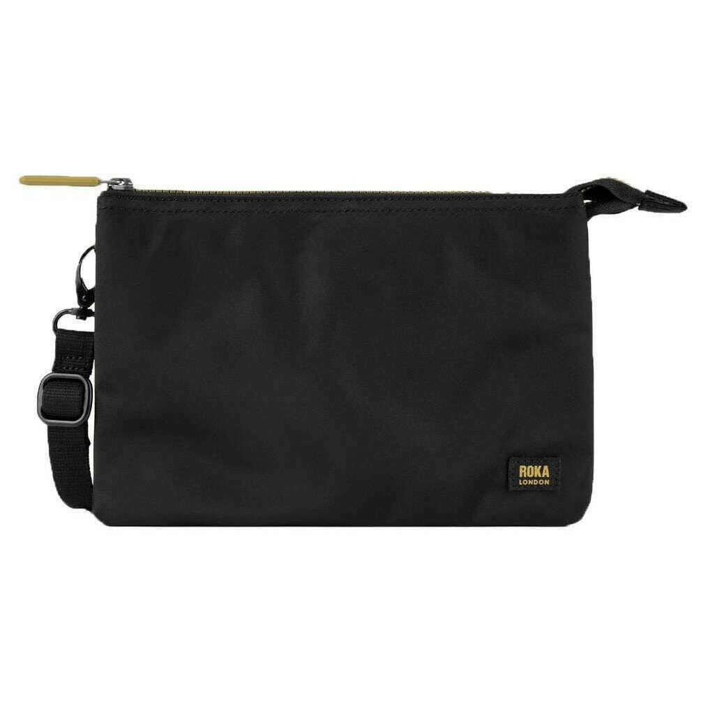 This unisex carnaby xl gold label recycled nylon crossbody bag has been made from 100% recycled nylon (triple-coated), featured in a black colour and is from the brand Roka. It measures 25cm(height) x 17cm(width) x 3cm(depth). All the bags come complete with roka packaging. The Roka Carnaby XL Gold Label Recycled Nylon Crossbody Bag - Black/Gold offers practicality and organisation when it comes to your day-to-day essentials with its weather resistant recycled nylon material. It has three separate compartments, each with various pockets and slots for cards, coins and notes as well as being big enough to store most mobile phones. It is the perfect accessory that allows you to carry your wallet as a bag with a little extra room for a few more bits and bobs. It is fitted with adjustable webbed strap and is designed to be durable and lightweight as well as sustainable. The Carnaby XL is an all-round winner.