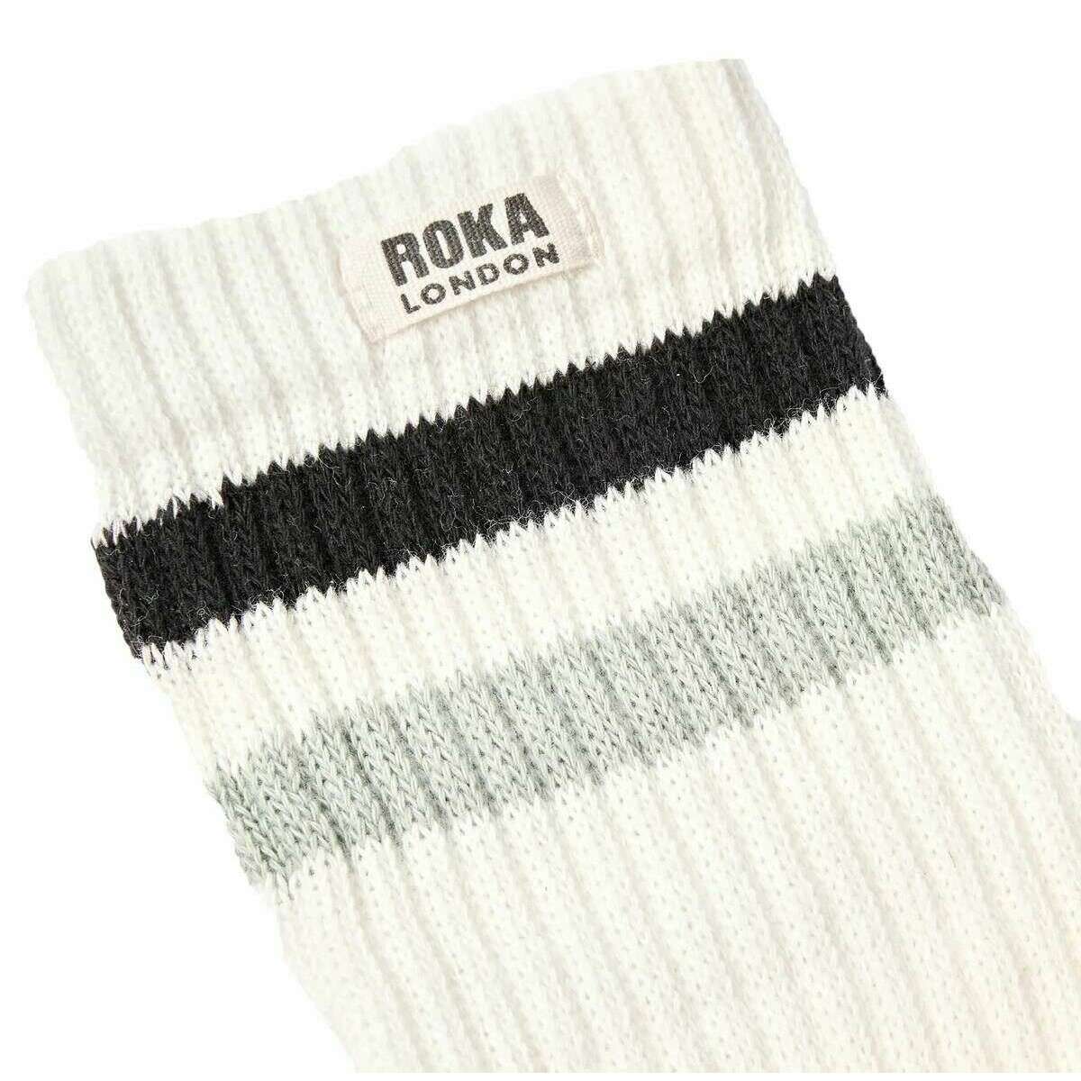These windsor socks for men are fashioned by the brand Roka in a white colour and are made from 82% organic cotton, 10% nylon and 2% elastane. Also the black/mist grey/white socks are designed in a striped pattern, All the socks come complete with roka packaging. The Roka Windsor Socks - Black/Mist Grey/White offer natural breathability and lasting softness for ultimate comfort. The classic crew length is elevated with signature double stripes, while a soft stretch cuff ensures they stay put throughout the day. Designed to keep their shape, colour, and softness wash after wash, these socks are ideal for commuting, gym mornings, and everything in between.
