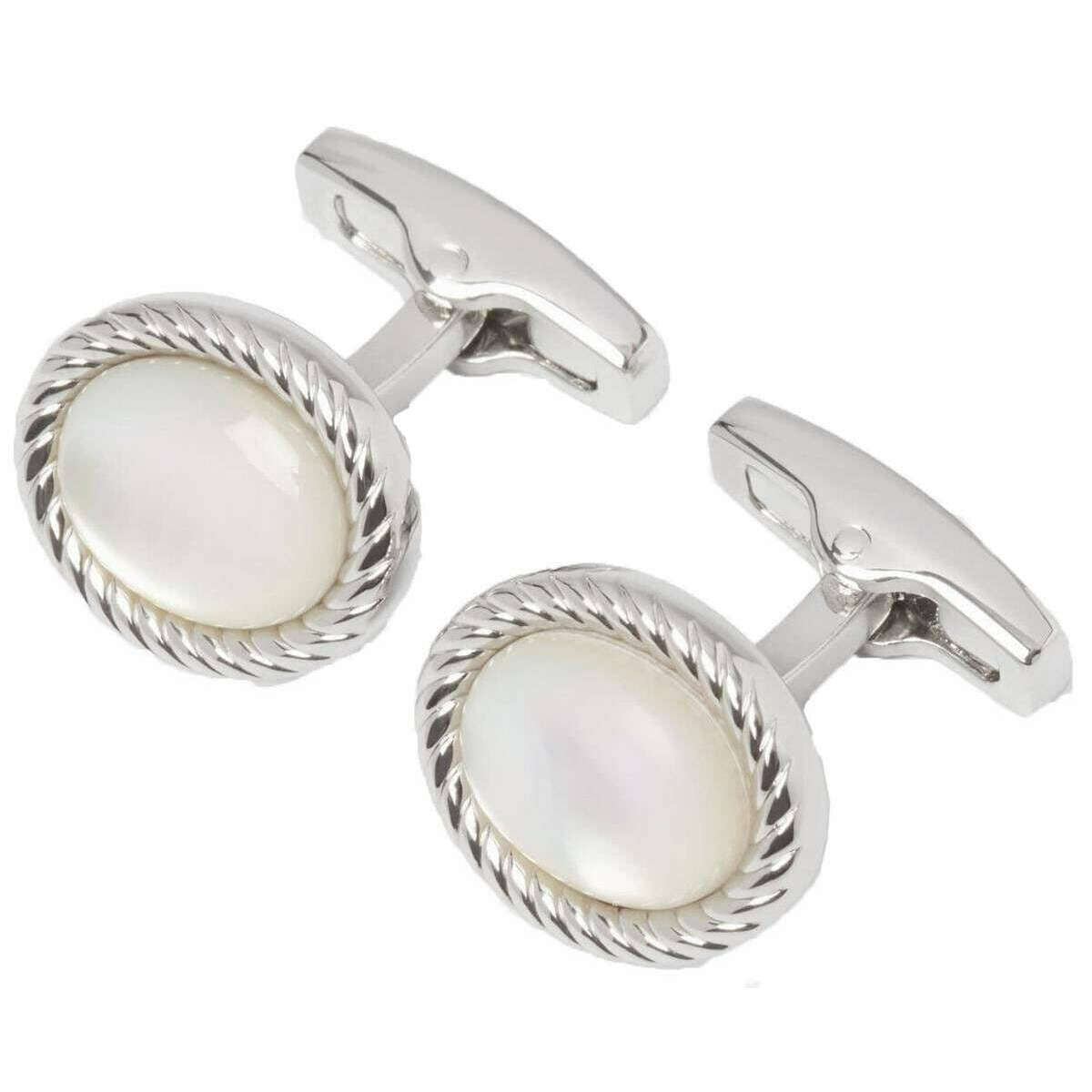 Brought to you by the brand Simon Carter, these white/silver men's charles mother of pearl cufflinks are made from rhodium plated metal and mother of pearl. All the cufflinks come complete with simon carter packaging. The Simon Carter Charles Mother of Pearl Cufflinks - White/Silver feature an elegant rope edge design that surrounds a classy mother of pearl stone. This set of cufflinks are the perfect finishing touch for any formal occasion and make a great gift for all gentlemen!