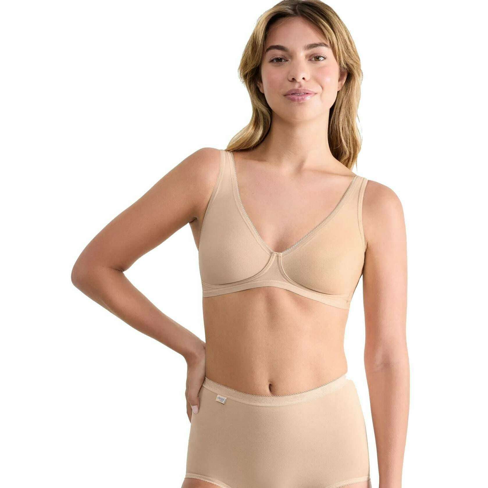This women's basic+ soft bra by the brand Sloggi is made from 80% cotton, 18% elastane and 2% polyamide and is showcased in beige. Also the skin beige underwear is designed in a plain pattern, It is recommended to machine wash at 40 degrees to keep this underwear in good condition. All the underwear comes complete with sloggi packaging. The Sloggi Basic+ Soft Bra - Skin Beige is a must-have for women looking for ultra comfort and luxury. This bra has been crafted from high-quality organic cotton that is made to last whilst upholding the soft feel and elasticity. The non-padded moulded cups, medium support and adjustable wider straps has been carefully designed to ensure a comfortable fit for an everyday wear, and the seamless fit gives an invisible look under any outfit.