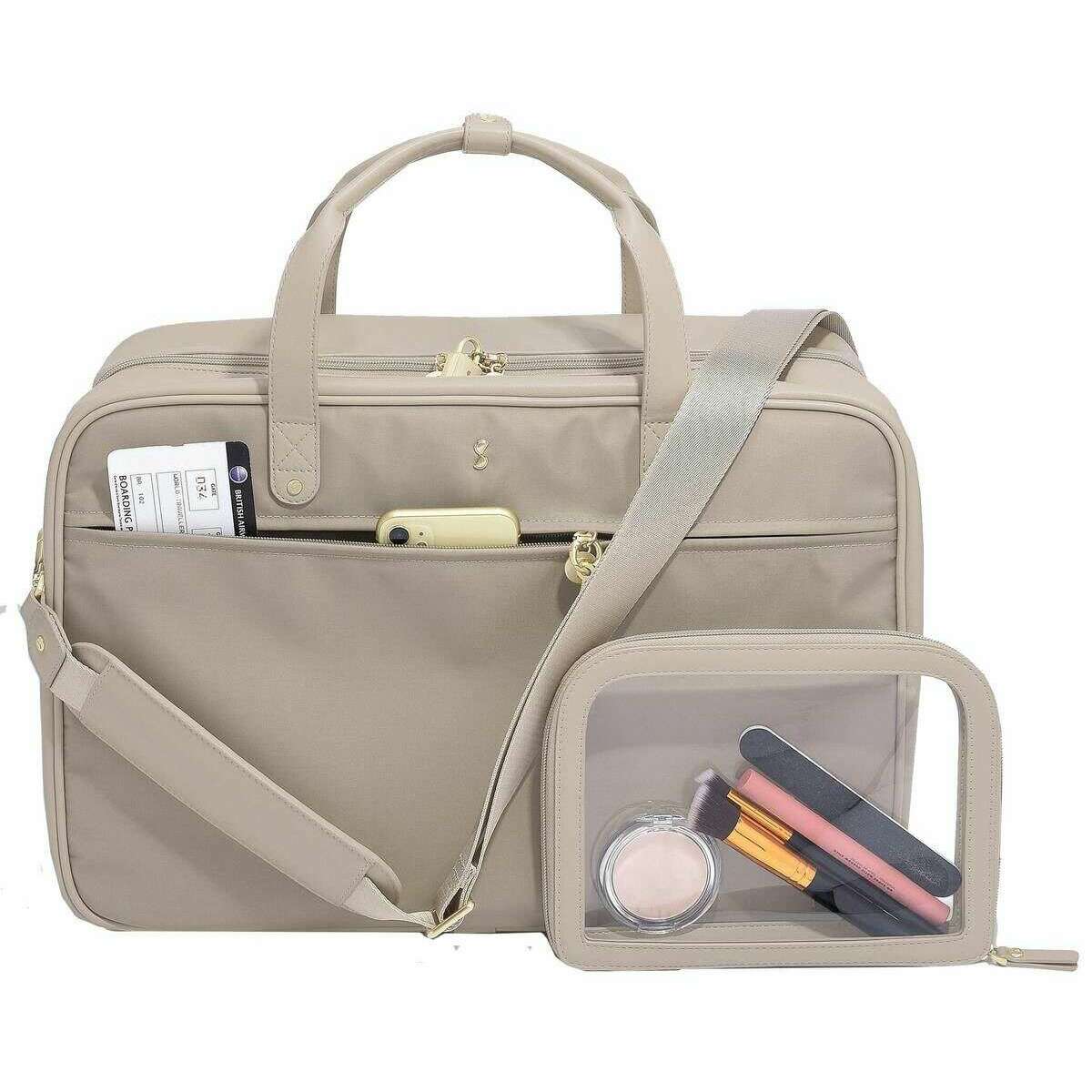 Using beige faux leather and velvet, this cabin bag by Stackers is perfect for women and a must have. It measures 33.5cm(height) x 22.5cm(width) x 46cm(depth). All the bags come complete with stackers packaging. The Stackers Cabin Bag - Clay Beige is perfect for on the go use. This beige cabin bags features a laptop pocket, two large zipped compartments and a range of smaller pockets. Complete with shoulder straps, backpack straps and a zip for added security.