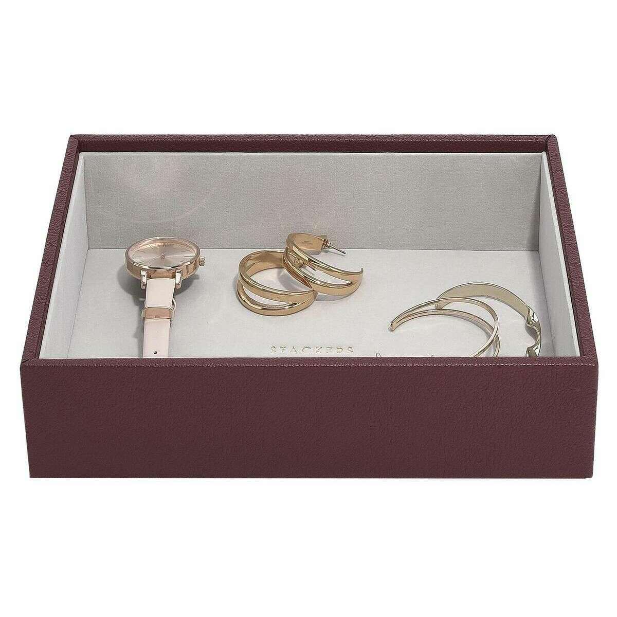 Designer Stackers has brought you this women's faux leather and velvet jewellery box using burgundy tones. It measures 6cm(height) x 25cm(width) x 18cm(depth). All the jewellery boxes come complete with stackers packaging. The Stackers Classic Chunky Jewellery Layer - Burgundy features a deep section for any of your jewellery. This beautiful deep burgundy jewellery layer is perfect for storing bigger items like bangle towers, ring rolls and even the stackers medium travel jewellery box.