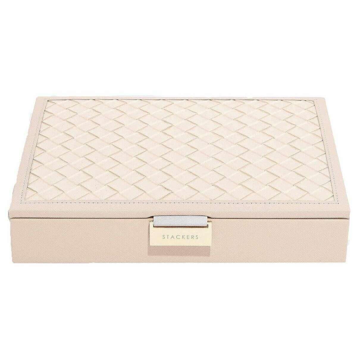 This well made women's classic jewellery box lid from Stackers comes in a blush pink woven colour and is manufactured from faux leather and velvet. It measures 4.7cm(height) x 25cm(width) x 18cm(depth). All the jewellery boxes come complete with stackers packaging. The Stackers Classic Jewellery Box Lid - Blush Pink Woven features a beautiful woven pink design. This jewellery box lid is perfect for storing all your jewellery items! Comes complete with multiple sized sections for rings, earrings, bracelets and necklaces.