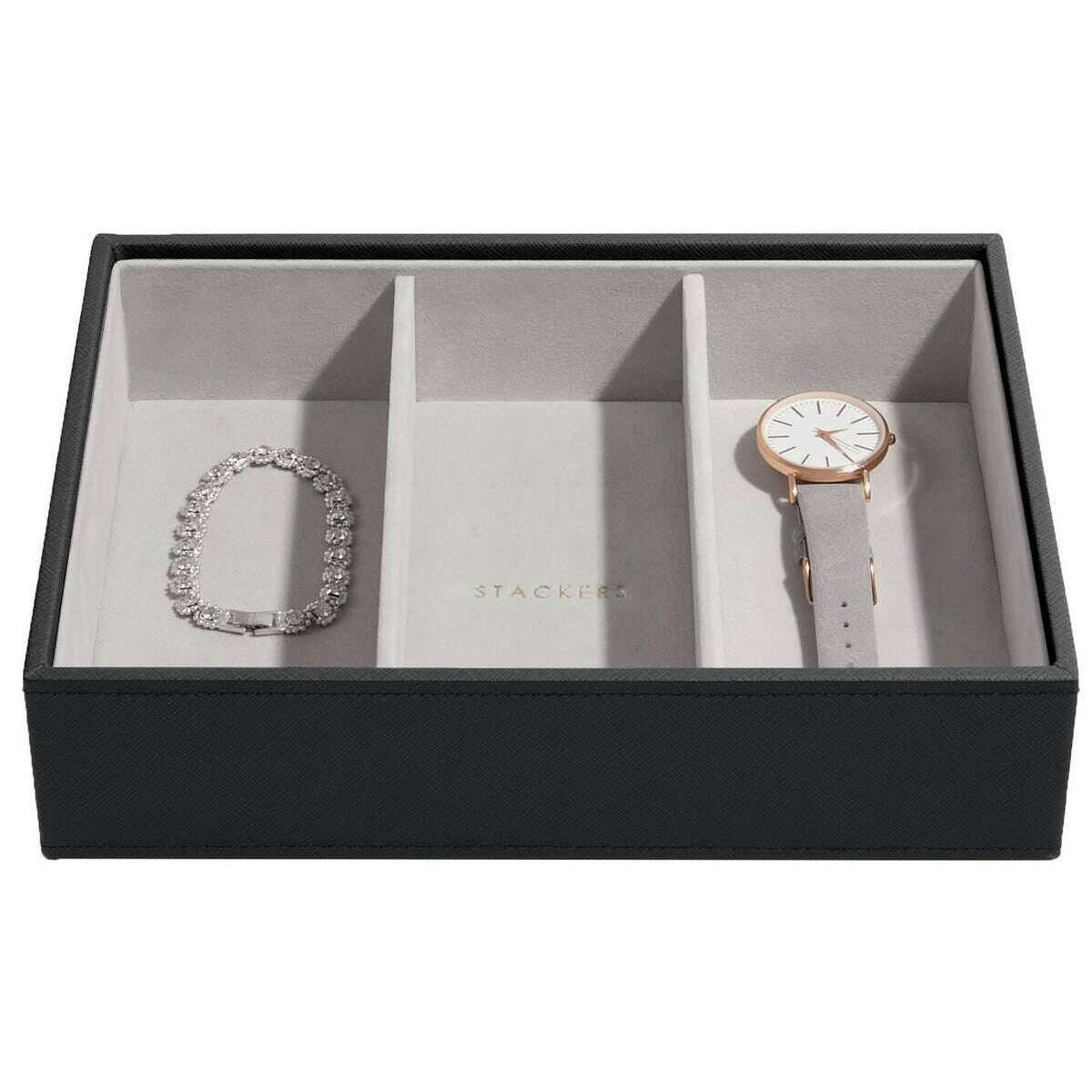 This women's classic set of 2 jewellery box has been made from faux leather and velvet, featured in a black colour and is from the brand Stackers. It measures 11cm(height) x 25cm(width) x 18cm(depth). All the jewellery boxes come complete with stackers packaging. The Stackers Classic Set of 2 Jewellery Box - Black Raffia features a unique black raffia jewellery box design. This jewellery box is perfect for storing all your jewellery items! Comes complete with two layers and multiple sized sections for earrings and bracelets and a larger section for watches and bangles.
