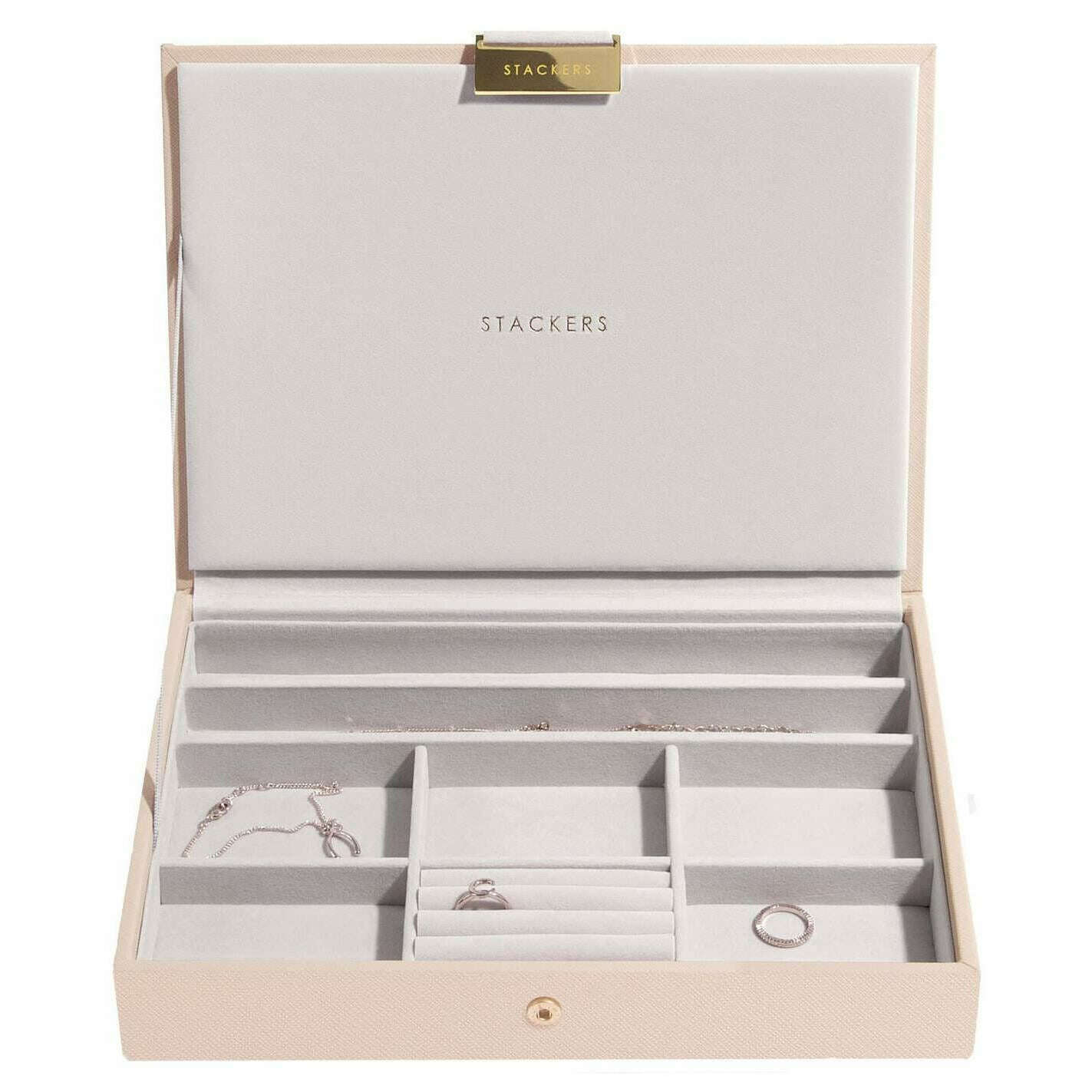 This women's classic set of 2 jewellery box by the brand Stackers is made from faux leather and velvet and is showcased in pink. It measures 11cm(height) x 25cm(width) x 18cm(depth). All the jewellery boxes come complete with stackers packaging. The Stackers Classic Set of 2 Jewellery Box - Blush Pink Raffia features a unique pink raffia jewellery box design. This jewellery box is perfect for storing all your jewellery items! Comes complete with two layers and multiple sized sections for earrings and bracelets and a larger section for watches and bangles.