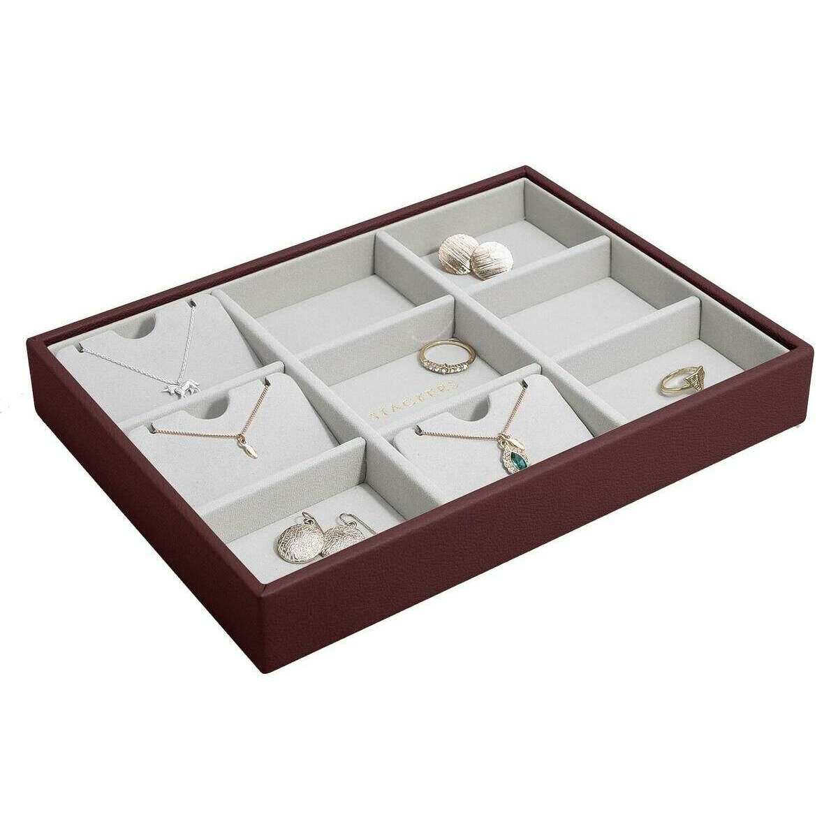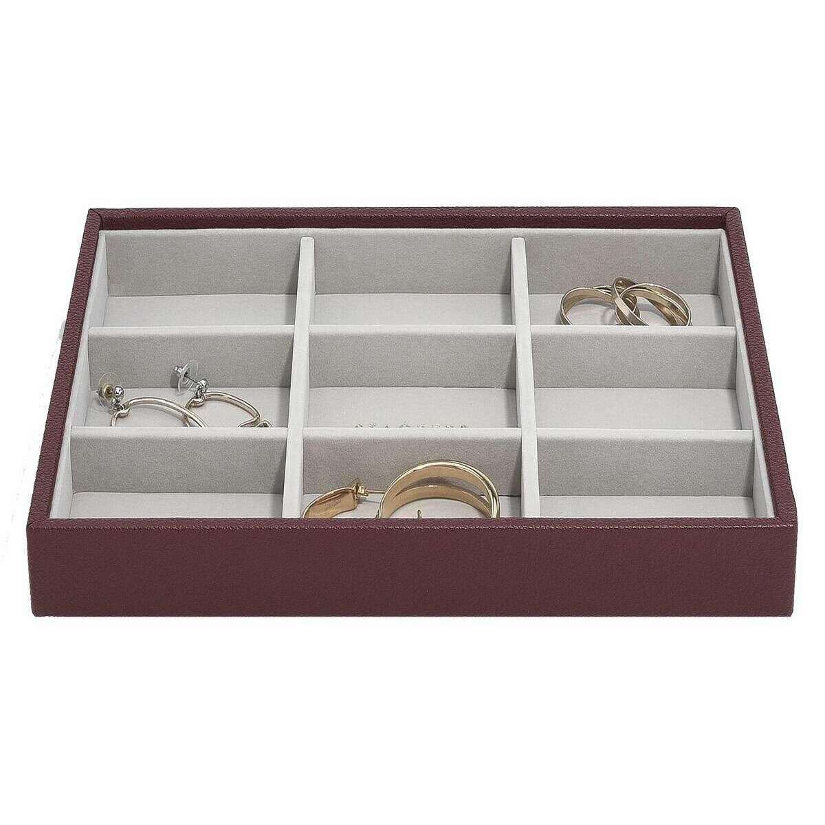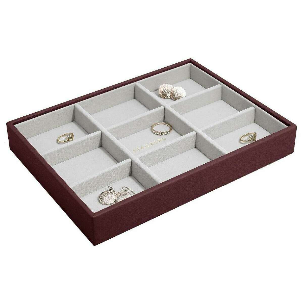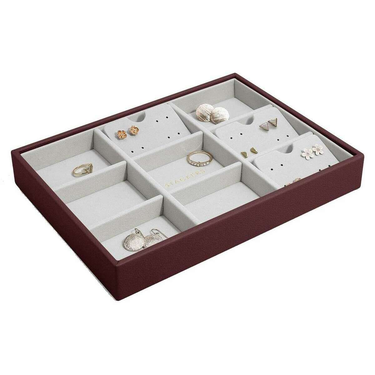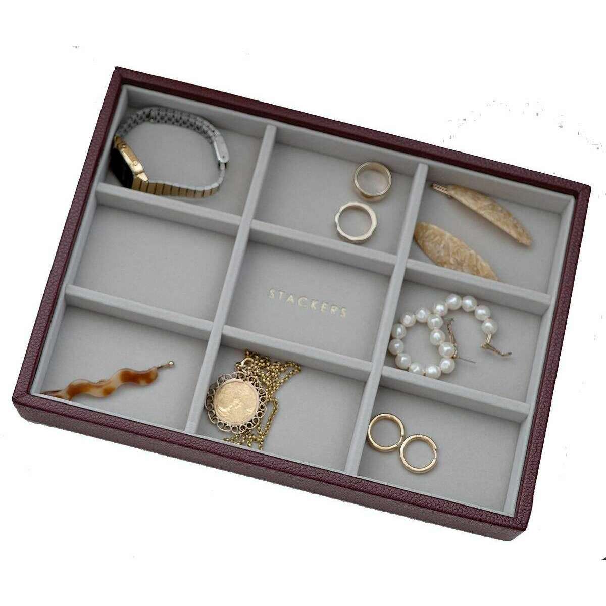 Manufactured from faux leather and velvet is this burgundy women's classic statement layer by the designer Stackers. It measures 3.7cm(height) x 25cm(width) x 18cm(depth). All the jewellery boxes come complete with stackers packaging. The Stackers Classic Statement Layer - Burgundy features multiple sections for all your rings and stud earrings. This beautiful classic burgundy jewellery layer is perfect for keeping organised as it has a pendant accessory or earing accessory in each section.