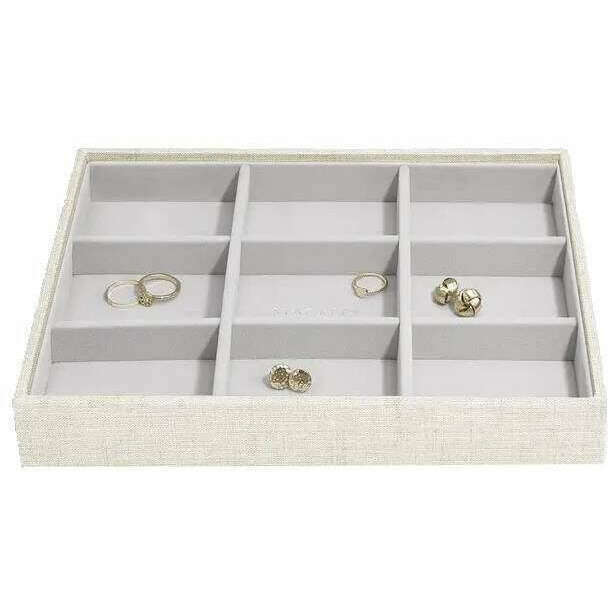 This women's classic statement tray has been made from faux leather and linen, featured in a beige colour and is from the brand Stackers. It measures 3.7cm(height) x 25cm(width) x 18cm(depth). All the jewellery boxes come complete in stackers packaging. The Stackers Classic Statement Tray - Oatmeal/Linen Beige has been cleverly created and designed to hold all of your earrings perfectly. It can be added to any other classic jewellery tray to create a jewellery box or it can be used on its own. You won't have to compromise on organisation.