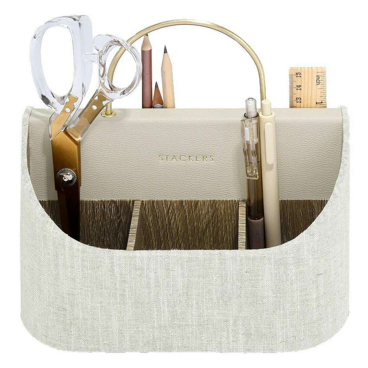 This desk caddy for women is fashioned by the brand Stackers in a beige colour and is made from faux leather. It measures 21cm(height) x 21cm(width) x 13cm(depth). All the desk accessories come complete with stackers packaging. The Stackers Desk Caddy - Oatmeal Beige/Linen Beige is a must have for any desk! This beige desk caddy is perfect for storing stationary and even has a handle which makes it easily portable.
