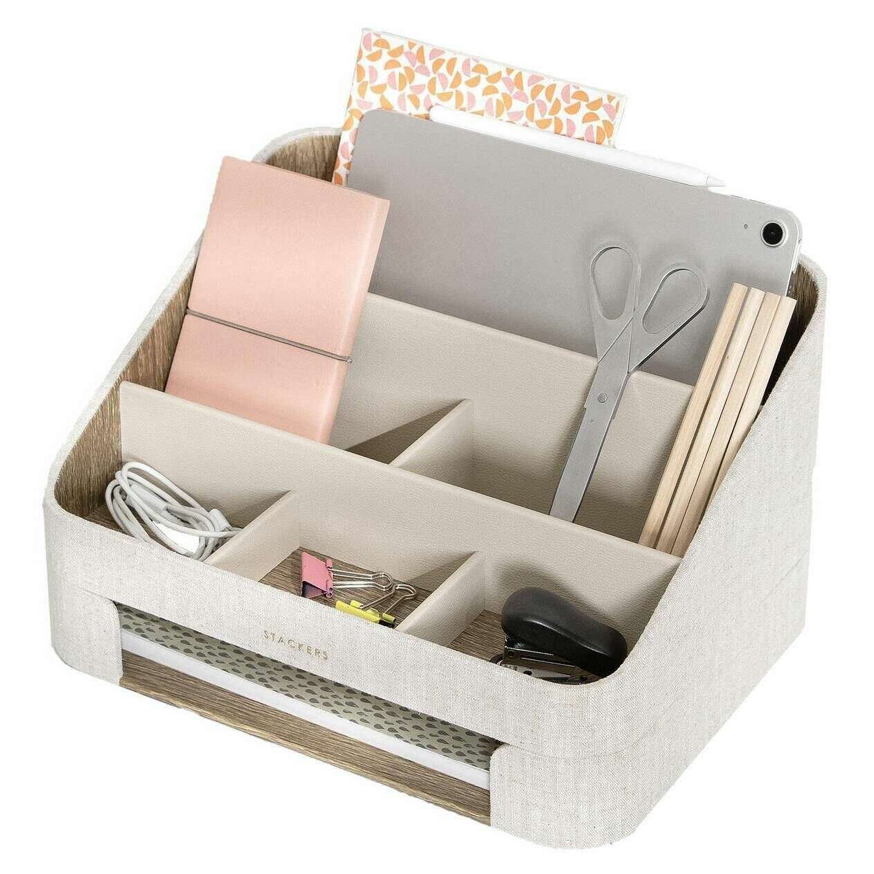 Brought to you by the brand Stackers, this oatmeal beige/linen beige women's desk organiser set is made from faux leather. It measures 20cm(height) x 25cm(width) x 33cm(depth). All the desk accessories come complete with stackers packaging. The Stackers Desk Organiser Set - Oatmeal Beige/Linen Beige features a beautiful beige and brown design. This desk organiser has many sections for stationary, notebooks and many more trinkets. Comes complete with a letter tray for extra storage.