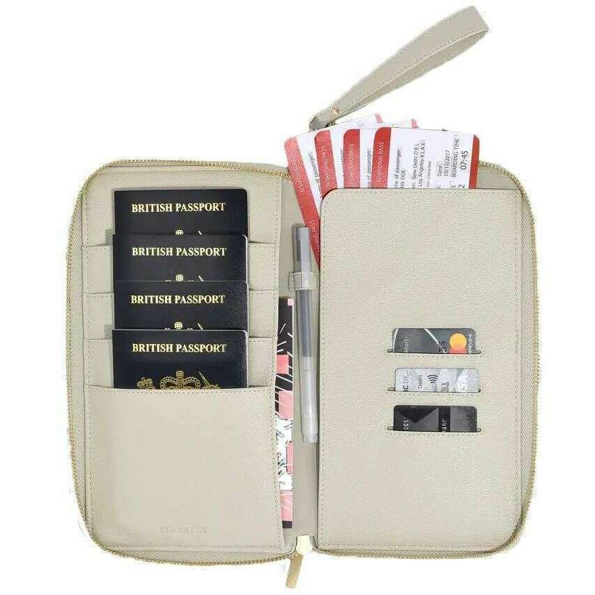 Brought to you by the brand Stackers, this oatmeal/linen beige women's family passport holder is made from faux leather and linen. All the purses come complete in stackers packaging. The Stackers Family Passport Holder - Oatmeal/Linen Beige is a travelling must-have for a family of 4 or smaller to keep your documents safe, secure and in one place to keep those airport trips stress and hassle free. Featuring 4 passport sleeves, 2 internal pockets to keep tickets and other documents secure, card holders, a pen holder, and an external zipper pocket for quick access items. The small and compact design is a perfect size to fit in all hand luggage without taking up room for snacks, books, etc.