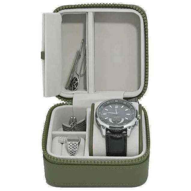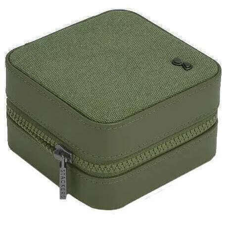 Designer Stackers has brought you this men's faux leather and canvas gentlemen's box using green tones. It measures 11cm(height) x 11cm(width) x 7cm(depth). All the gentlemen's boxes come complete in stackers packaging. The Stackers Square Travel Watch and Jewellery Box - Green ideal for any gentleman looking for a smart and classy way to keep their watch and small jewellery pieces organised and safe. Featuring a padded watch roll to keep your watch free from scratches, a ring roll for rings or earrings, a small deep compartment for loose items such as cufflinks and the lid having a door compartment for any extra loose items. The zipper closure ensures security when travelling or resting on your side table or desk.