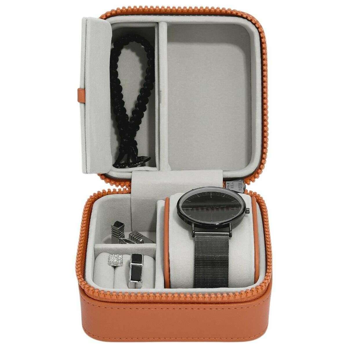 This well made men's square travel watch and jewellery box from Stackers comes in a orange colour and is manufactured from faux leather and velvet. It measures 11cm(height) x 11cm(width) x 7cm(depth). It is recommended to wipe clean to keep this gentlemen's box in good condition. All the gentlemen's boxes come complete with stackers packaging. The Stackers Square Travel Watch and Jewellery Box - Orange ideal for any gentleman looking for a smart and classy way to keep their watch and small jewellery pieces organised and safe. Featuring a padded watch roll to keep your watch free from scratches, a ring roll for rings or earrings, a small deep compartment for loose items such as cufflinks and the lid having a door compartment for any extra loose items. The zipper closure ensures security when travelling or resting on your side table or desk.
