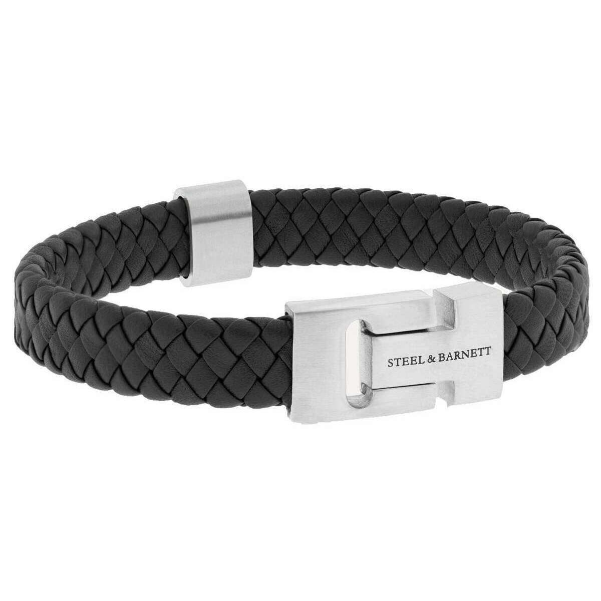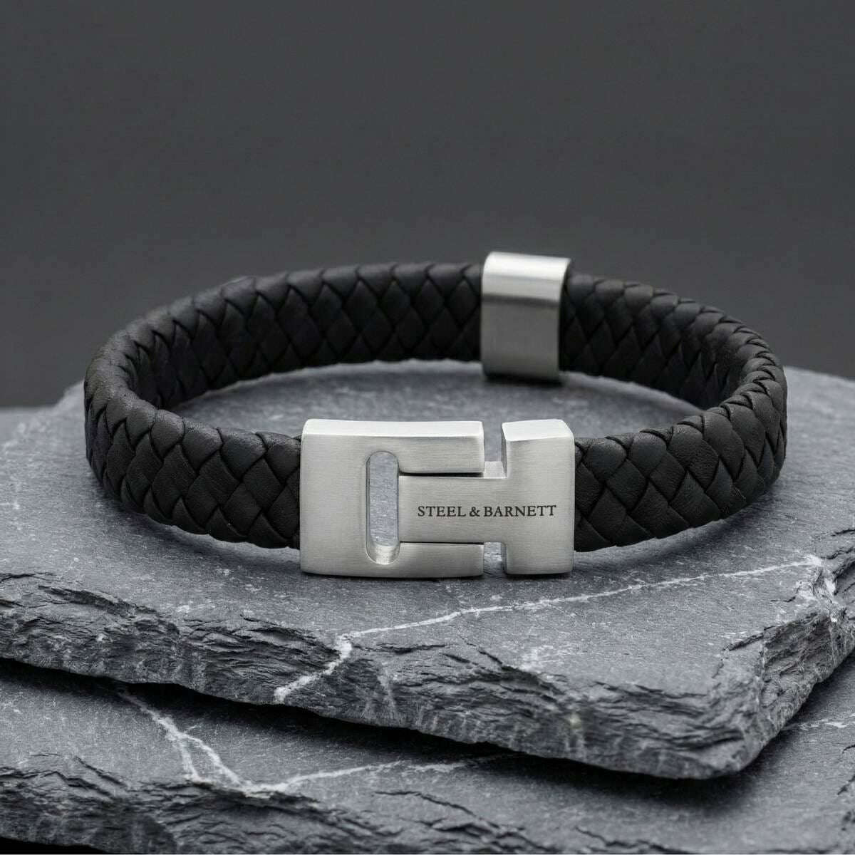 This men's harrison thick braided leather bracelet has been made from 100% nappa leather and stainless steel, featured in a black colour and is from the brand Steel & Barnett. All the bracelets come complete with steel & barnett packaging. The Steel & Barnett Harrison Thick Braided Leather Bracelet - Black/Silver showcases a sophisticated fusion of premium craftsmanship and refined design. Handcrafted from 100% genuine Nappa leather, its thick, intricately braided structure delivers both durability and timeless appeal. At 12 mm wide, it offers a commanding yet versatile presence that complements a variety of looks. The bracelet is finished with a brushed steel clasp, crafted from 316L stainless steel for superior strength and corrosion resistance. Its magnetic fastening ensures a secure and effortless closure, making it as practical as it is stylish. Perfectly suited for the modern professional, the Harrison transitions seamlessly between business attire and casual wear adding a distinguished touch to any ensemble.