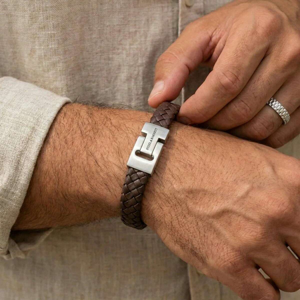 Manufactured from 100% nappa leather and stainless steel is this brown men's harrison thick braided leather bracelet by the designer Steel & Barnett. All the bracelets come complete with steel & barnett packaging. The Steel & Barnett Harrison Thick Braided Leather Bracelet - Brown showcases a sophisticated fusion of premium craftsmanship and refined design. Handcrafted from 100% genuine Nappa leather, its thick, intricately braided structure delivers both durability and timeless appeal. At 12 mm wide, it offers a commanding yet versatile presence that complements a variety of looks. The bracelet is finished with a brushed steel clasp, crafted from 316L stainless steel for superior strength and corrosion resistance. Its magnetic fastening ensures a secure and effortless closure, making it as practical as it is stylish. Perfectly suited for the modern professional, the Harrison transitions seamlessly between business attire and casual wear adding a distinguished touch to any ensemble.