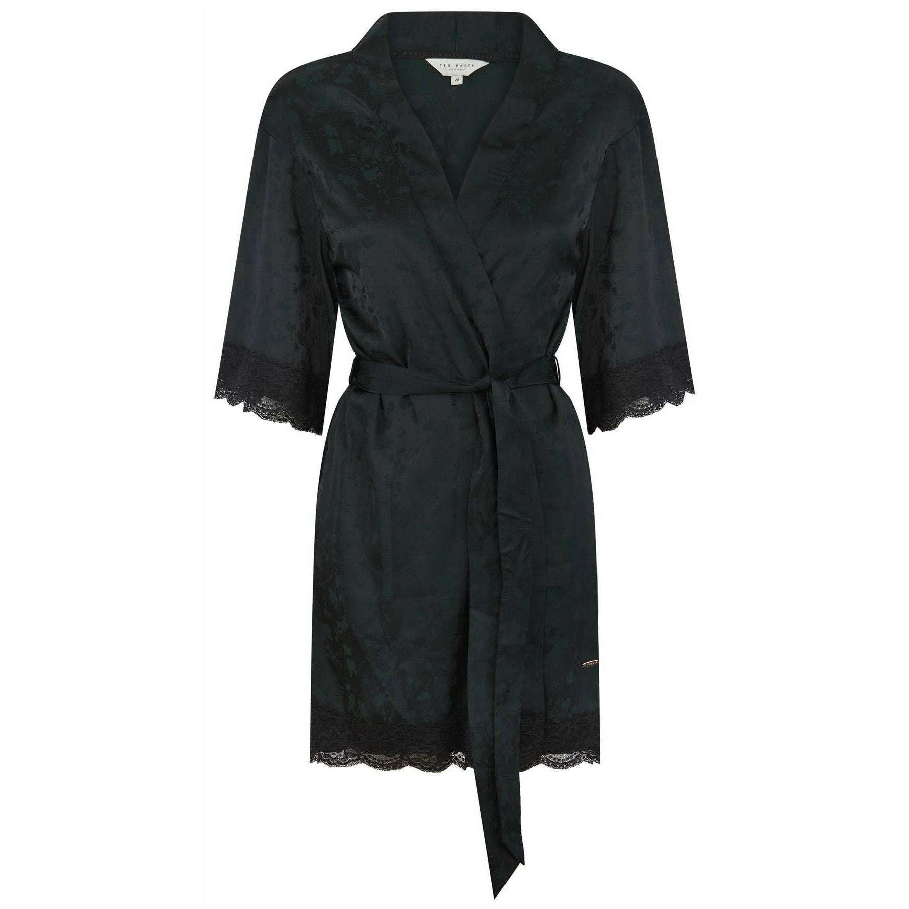 Using black 97% polyester and 3% spandex, this clara kimono robe by Ted Baker is perfect for women and a must have. Also the jet black dressing gown is designed in a plain pattern, All the dressing gowns come complete with ted baker packaging. The Ted Baker Clara Kimono Robe - Jet Black luxurious and sophisticated, will become a great addition to any ladies loungewear collection. Featuring a silky look with a floral design all over, a 3/4 length sleeve, lace on the sleeves and bottom and a belt combines to create a chic appeal. The soft and breathable fabric keeps you warm whilst also cool when lounging in your home. Finished with a Ted Baker metal embellishment tag.