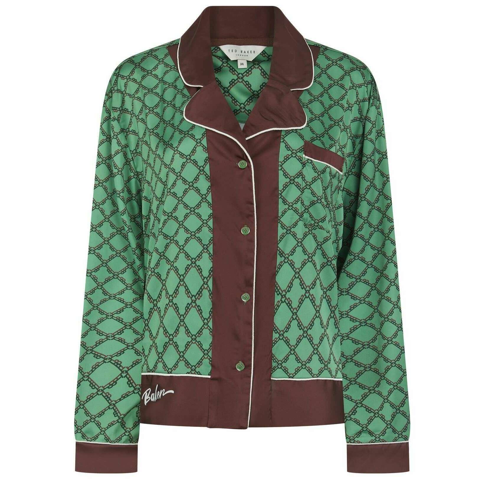 Perfect for women are these Ted Baker comfrey green dahlia traditional pyjamas, they are also made from 97% polyester and 3% spandex. Also the comfrey green pyjamas are designed in a diamonds pattern, All the pyjamas come complete with ted baker packaging. The Ted Baker Dahlia Traditional Pyjamas - Comfrey Green feature a modern luxurious design with brown features across and white piping for contrast. These pjs are the perfect pair for any woman featuring long sleeves and trousers to ensure warmth whilst having a satin finish for a breathable wear. These also feature an elasticated waistband and tie for a great fit with loose arms and legs for flow throughout. These would make the perfect gift to a girly loved one. Finished with a Ted Baker branding on the bottom of the top.