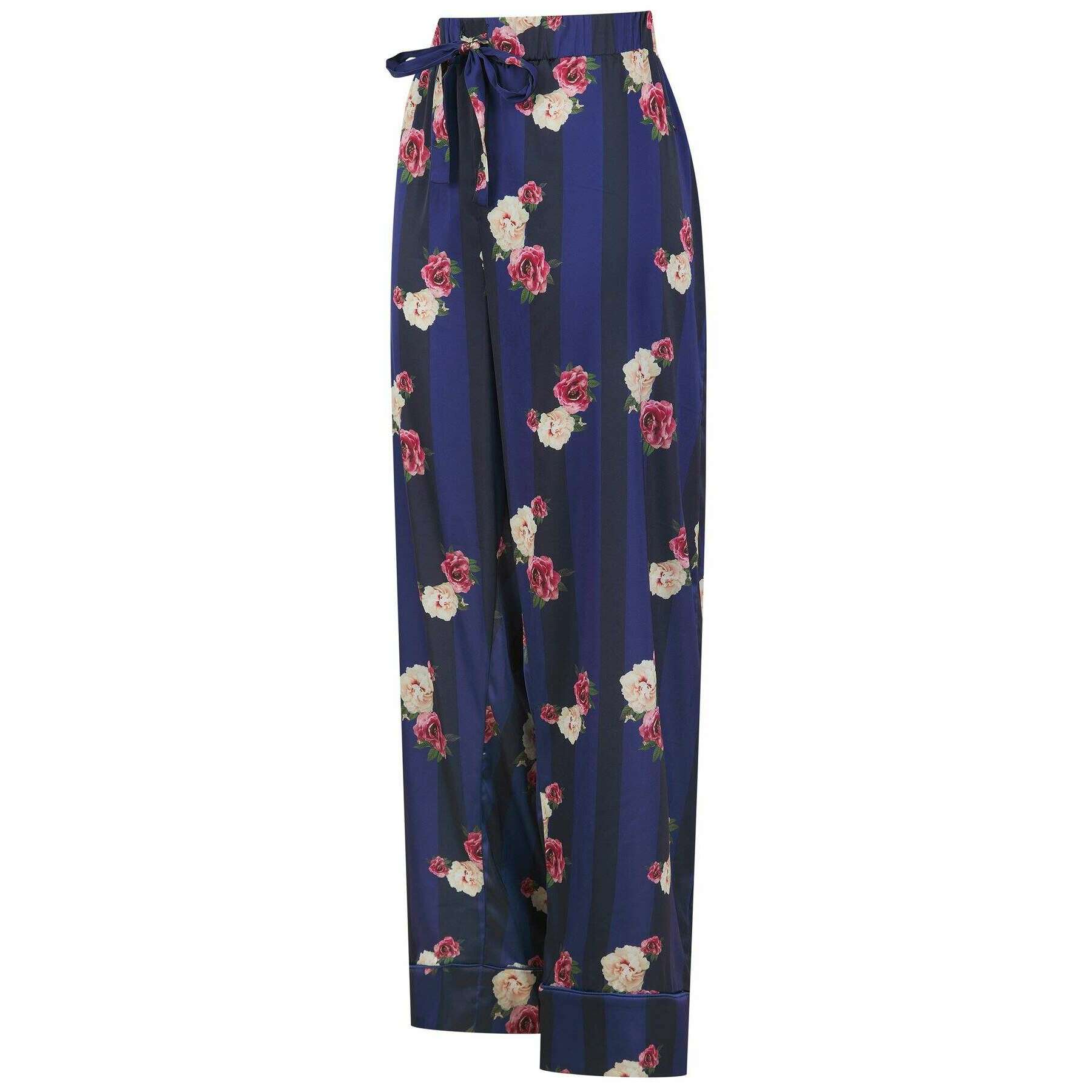 These women's hallie traditional pyjamas by the brand Ted Baker are made from 97% polyester and 3% spandex and are showcased in navy. Also the navy pyjamas are designed in a floral pattern, All the pyjamas come complete with ted baker packaging. The Ted Baker Hallie Traditional Pyjamas - Navy feature a striped background with a floral design all over. These pjs are the perfect pair for any woman featuring long sleeves and trousers to ensure warmth whilst having a satin finish for a breathable wear. These also feature an elasticated waistband and tie for a great fit with loose arms and legs for flow throughout. These would make the perfect gift to a girly loved one. Finished with a Ted Baker metal embellishment tag on both top and bottom.