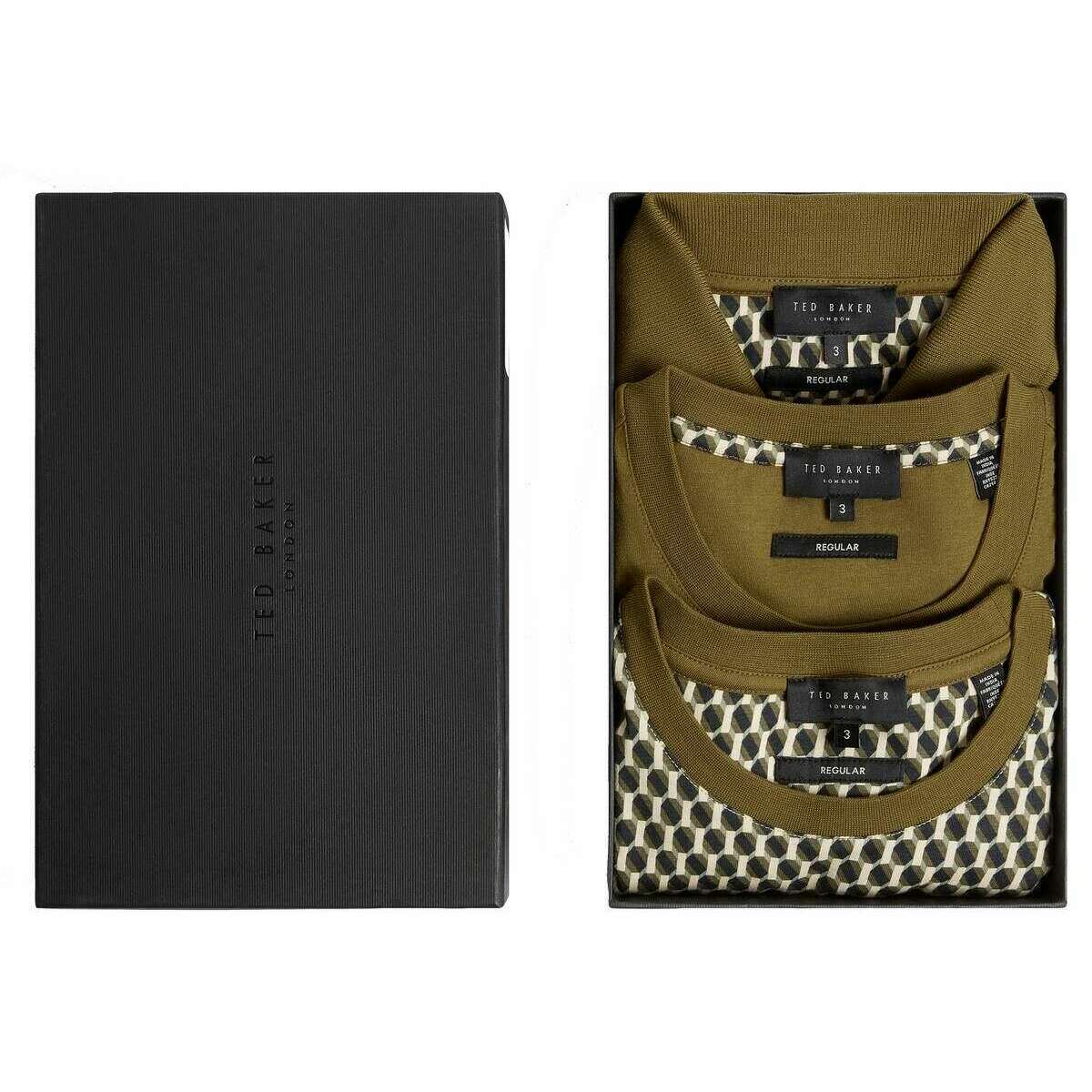 Perfect for men is this Ted Baker olive green sangs 3 pack geometric jersey t-shirt, it is also made from 100% cotton. It is recommended to machine wash at 30 degrees to keep this t-shirt in good condition. 3 pack t-shirts are value for money ensuring they are a good buy, All the t-shirts come complete with ted baker presentation box. The Ted Baker Sangs 3 Pack Geometric Jersey T-Shirt - Olive Green features two unique t-shirts and a polo shirt for versatile styling for different occasions. These shirts have been crafted from all cotton giving these a soft and comfortable wear whilst being fully skin-friendly, great for those with sensitive skin. These make the perfect gift to your loved ones or to treat yourself.