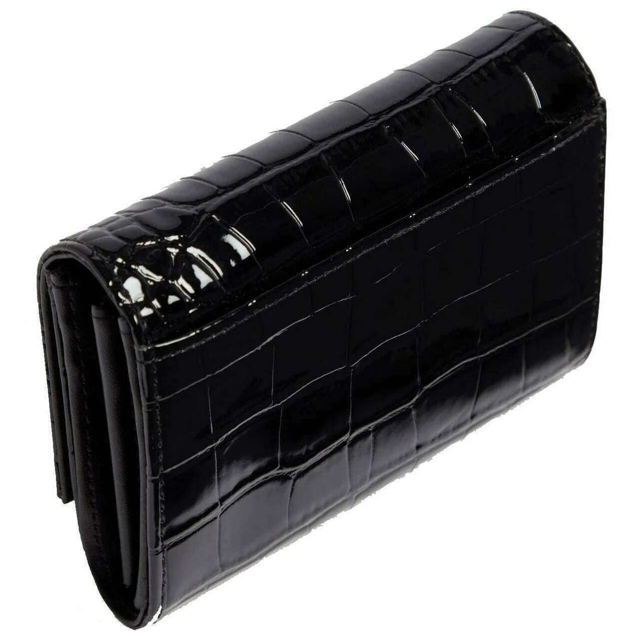• Croc Effect , Patent PU Leather , Flap Popper Closure , Middle Zipper Coin Compartment , 3 Interior Compartments , Exterior Back Slip Compartment , Gold Hardware