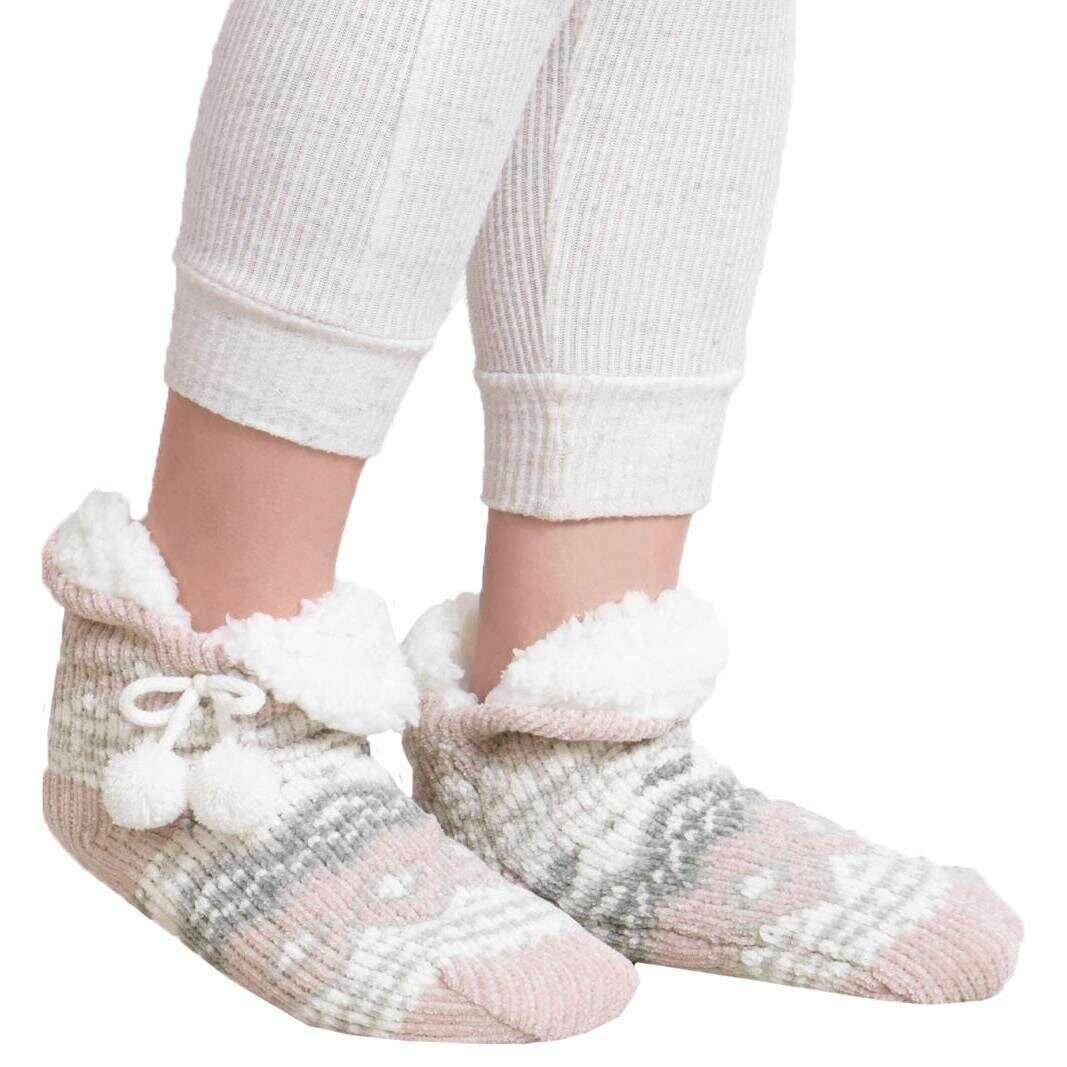 These well made women's crop chenille knitted slipper socks from Totes Toasties come in a pink colour and are manufactured from 100% polyester. Also the pink socks are designed in a fairisle pattern, It is recommended to machine wash at 30 degrees to keep these socks in good condition. All the socks come complete with totes toasties packaging. The Totes Toasties Crop Chenille Knitted Slipper Socks - Pink are the perfect pair to either do chores around the house whilst keeping your feet nice and cosy or just to have on when cuddled up on the sofa watching your favourite winter movie. This gorgeous design is girly and feminine and has been crafted with sherpa lining for optimal warmth. This pair is the perfect gift to your loved or to yourself!
