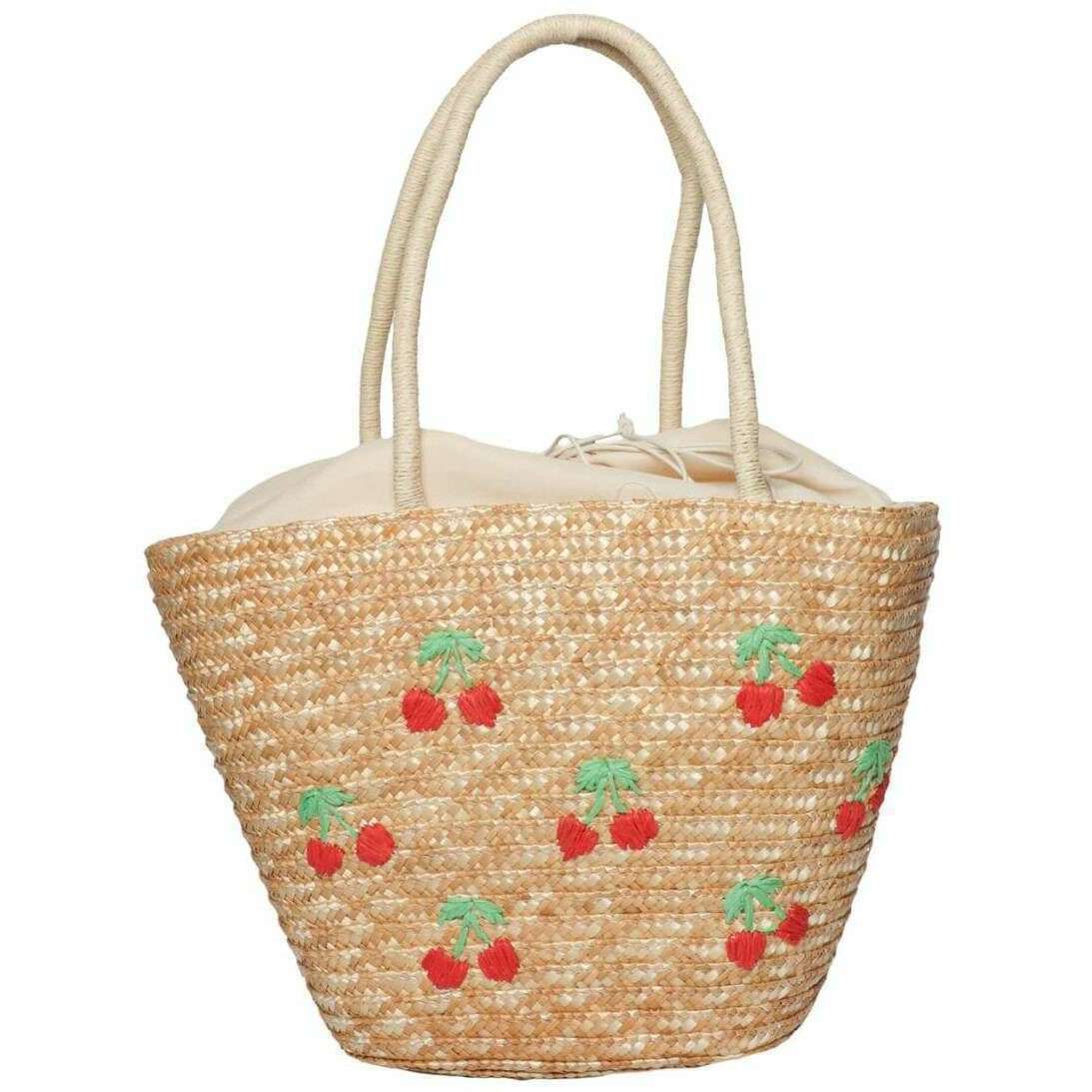 Manufactured from 80% wheat straw, 10% polyester and 10% paper is this brown women's cherries beach bag by the designer Zelly. It measures 28cm(height) x 38cm(width) x 15cm(depth). It is recommended to sponge clean to keep this bag in good condition. All the bags come complete with zelly tags. The Zelly Cherries Beach Bag - Brown perfect for taking to the beach, for a picnic or exploring a new city is a gorgeous straw bag that is not only sturdy but extremely lightweight great for all occasions. Featuring two handles great for carrying by hand or on your shoulder, an internal drawstring bag to keep your belongings safe and to keep sand out, a large main compartment so you do not have to leave anything behind and an internal pocket to keep your smaller items in one place. The sweet and delicate cherry design adds a summery and fashionable look.